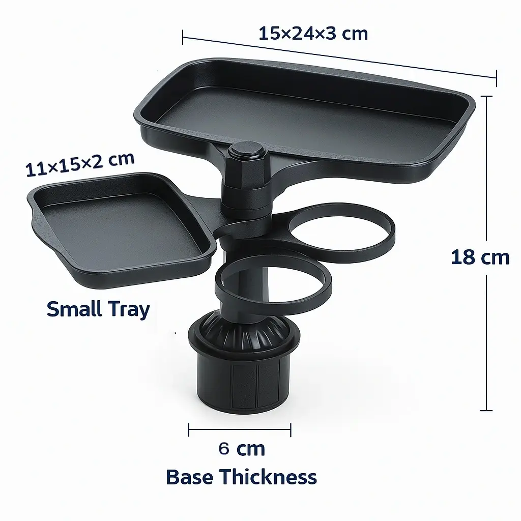 حسّن تنظيم مساحة سيارتك مع حامل الأكواب متعدد الوظائف وصينية الطعام – باللون الأسود! يتميز هذا المنظم بتصميم 3 في 1 يضم حامل أكواب مزدوجًا بحجم مدمج وصينية طعام مريحة للاستخدام أثناء التنقل. وبفضل قاعدة التثبيت القابلة للتعديل، يوفر حلاً آمنًا وموفرًا للمساحة لتخزين وتنظيم أغراض السيارة، ومناسبًا لمعظم أنواع المركبات.
