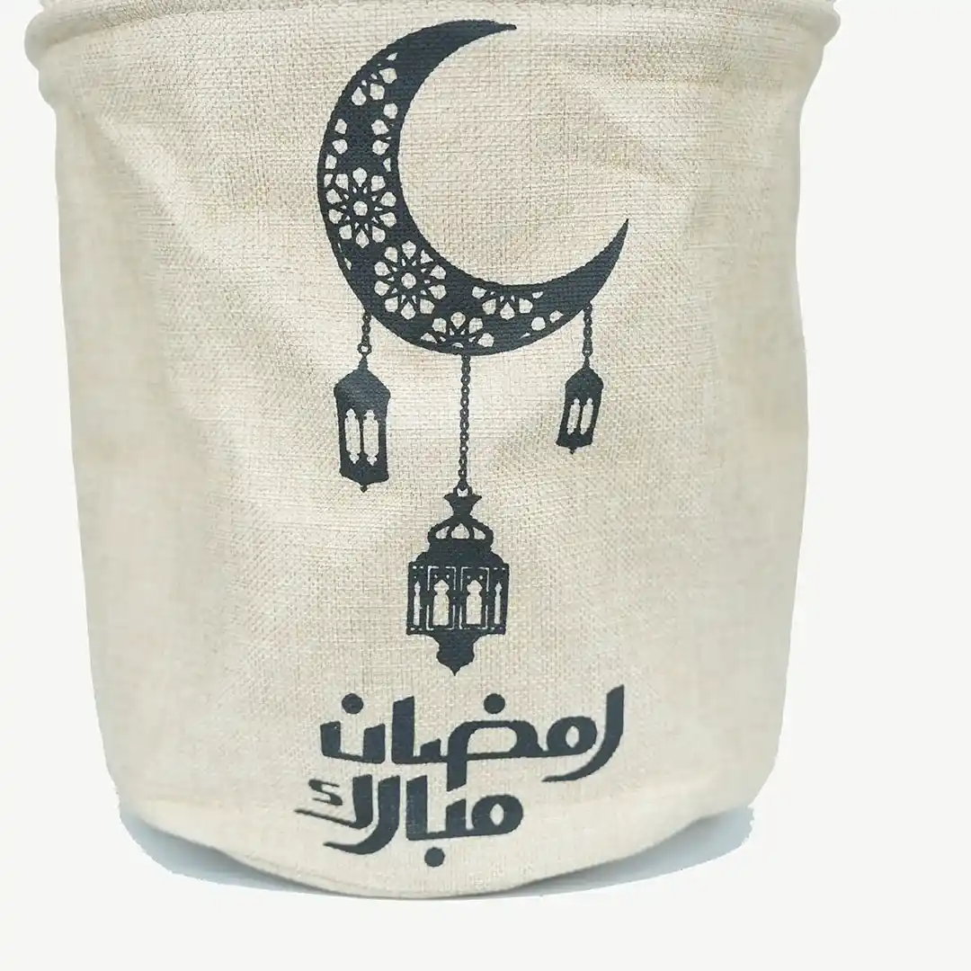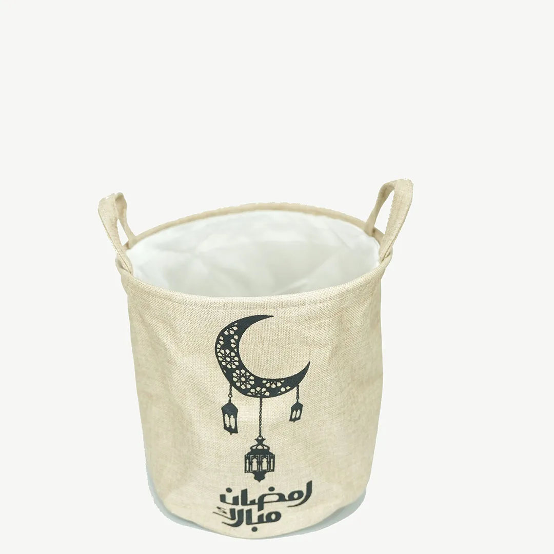 سلة هدايا كتان مزخرفة بعبارة "رمضان مبارك" ارتفاع 30 سم