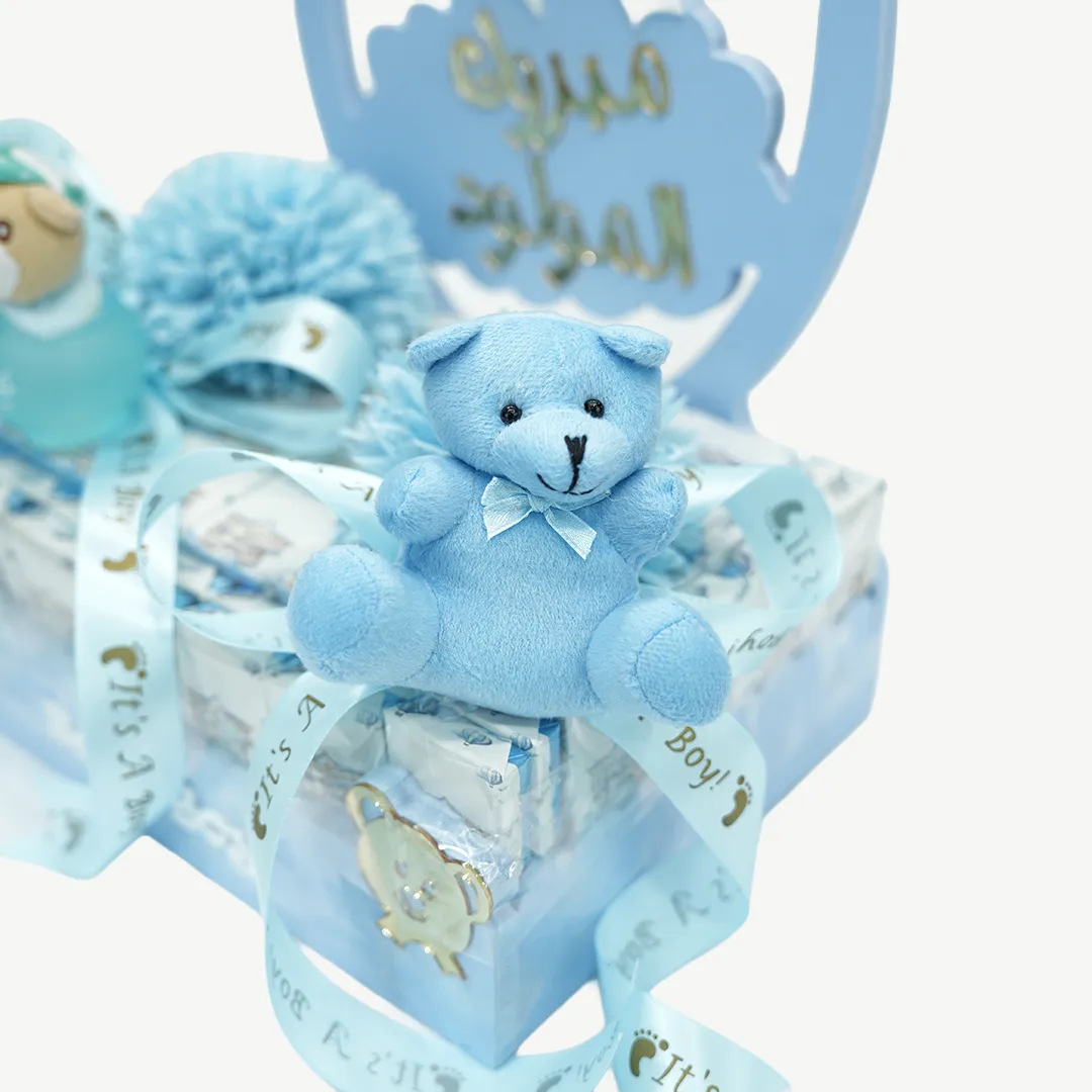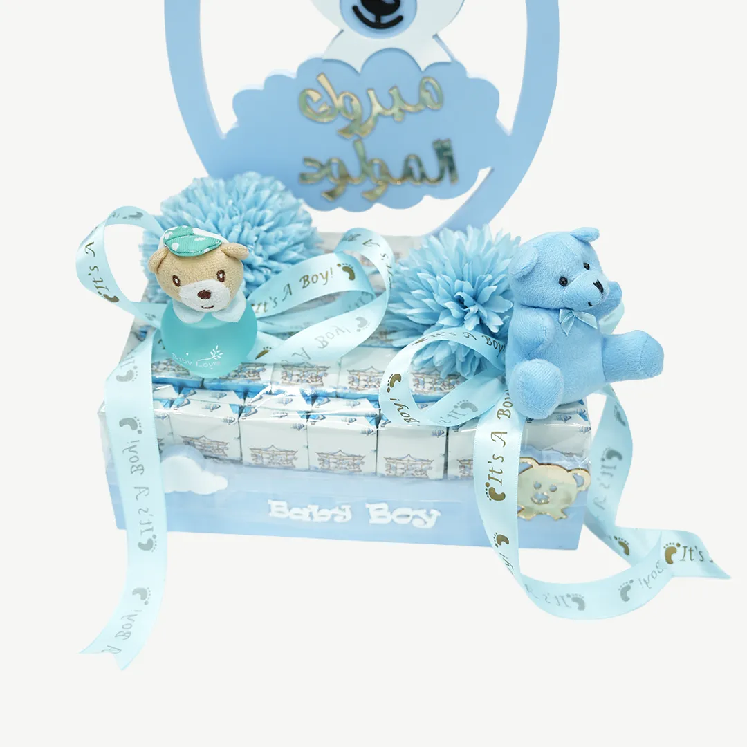 صندوق هدايا وتذكارات حفلة استقبال المولود الذي يحتوي على شوكولاتة مزينة باللون الوردي وشخصيات دببة تيدي هو تحفة فنية احتفالية، مصمم خصيصًا لاستقبال أميرتك الجديدة بأناقة لا مثيل لها. هذا العرض الضخم، الذي يبلغ ارتفاعه 35 سم وعرضه 30 سم، يتميز بخلفية دائرية رائعة تحمل رسمًا لطيفًا لدب تيدي والنقش الذهبي العربي “مبروك المولود”، ليبعث برسالة فرح لكل ضيف.
