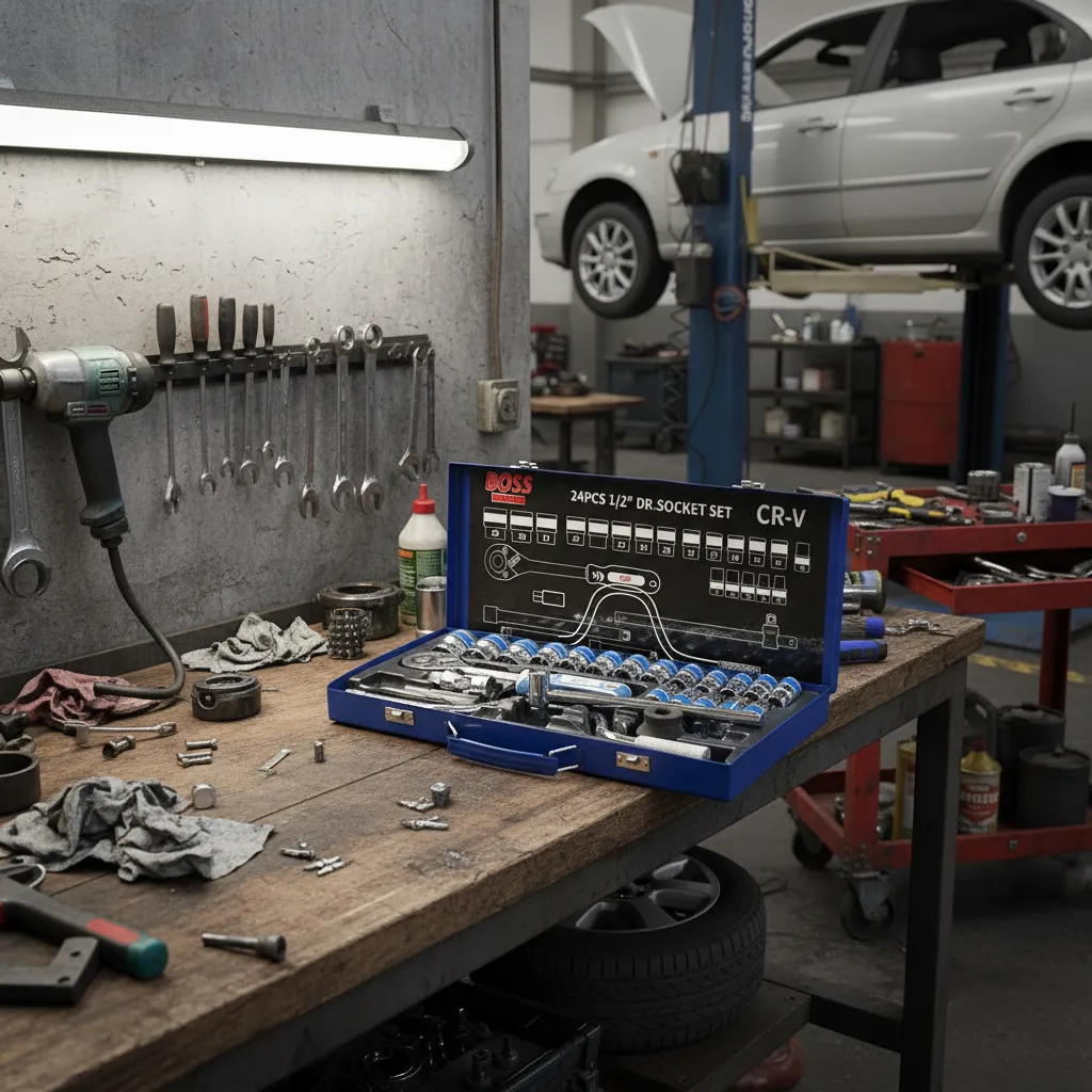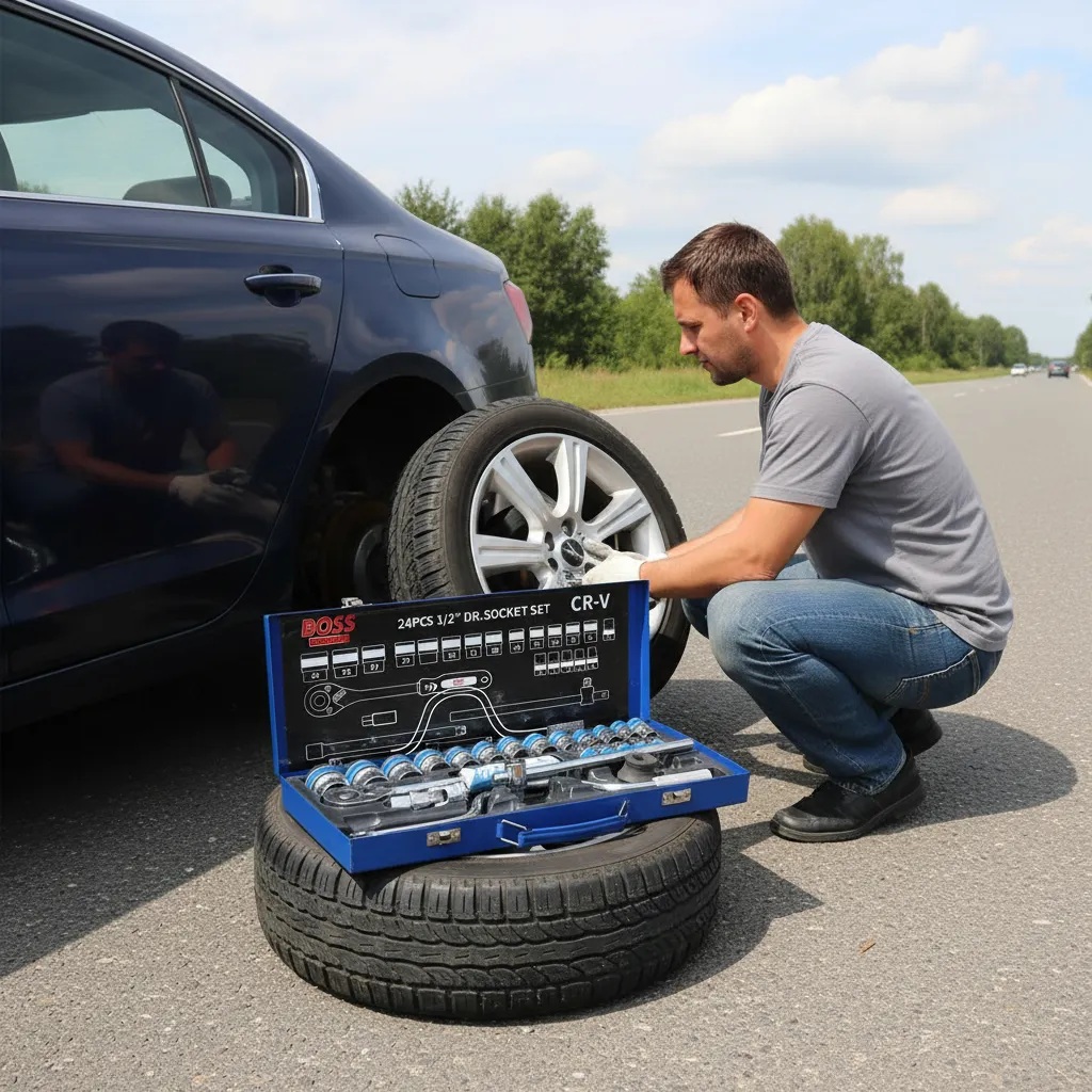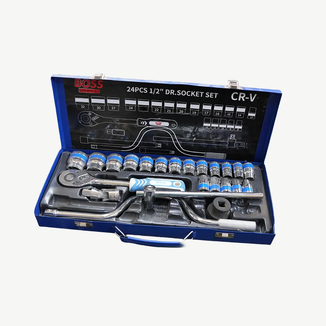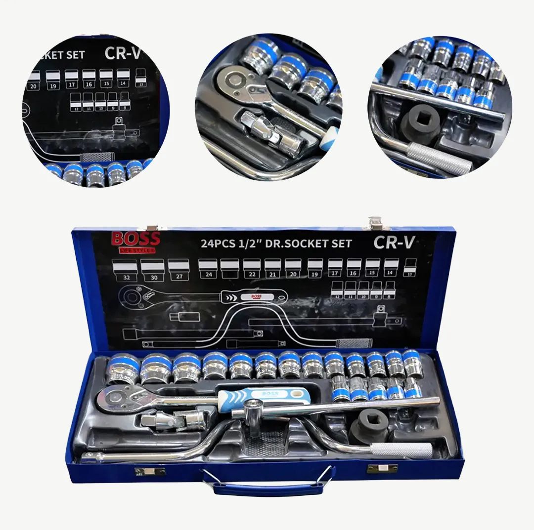 طقم عدة احترافي 24 قطعة من الصلب المجلفن! مع شنطة صاج متينة ووزن 2.5 كجم لقوة تحمل فائقة. لكل مهام الفك والتركيب!