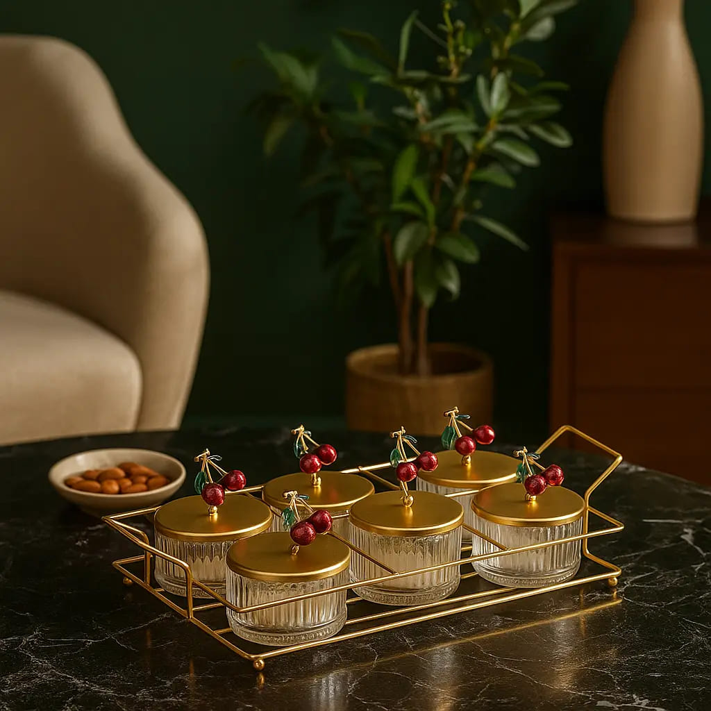 أضف لمسة من الفخامة والجاذبية إلى مائدتك مع طقم صواني التقديم بتصميم الكرز المكون من 6 قطع من لازود. مصنوع من مزيج أنيق من المعدن والزجاج، يجمع هذا الطقم بين العملية والجمال الفني — مثالي لتقديم الوجبات الخفيفة، الحلويات، أو المقبلات بأسلوب راقٍ.