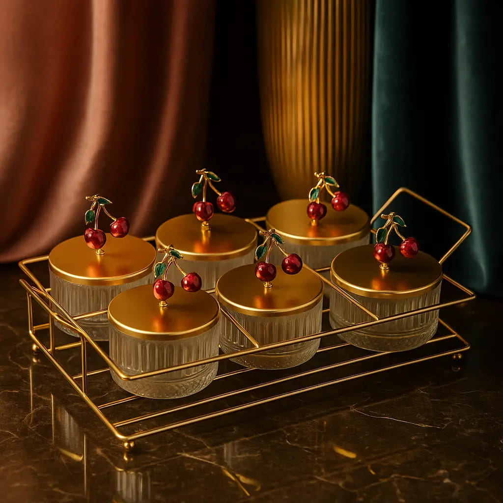 يحتوي الطقم على ثلاث أوعية زجاجية للوجبات الخفيفة، وثلاثة أغطية معدنية مزينة بمقابض على شكل كرز، وصينية معدنية مطلية باللون الذهبي تُبرز المجموعة بأناقة. يبلغ قطر الأوعية 9 سم وارتفاعها 6 سم، بينما تبلغ أبعاد الصينية 12 × 33 سم وارتفاعها 8 سم، مما يجعلها مثالية للاستخدام اليومي أو المناسبات الخاصة.