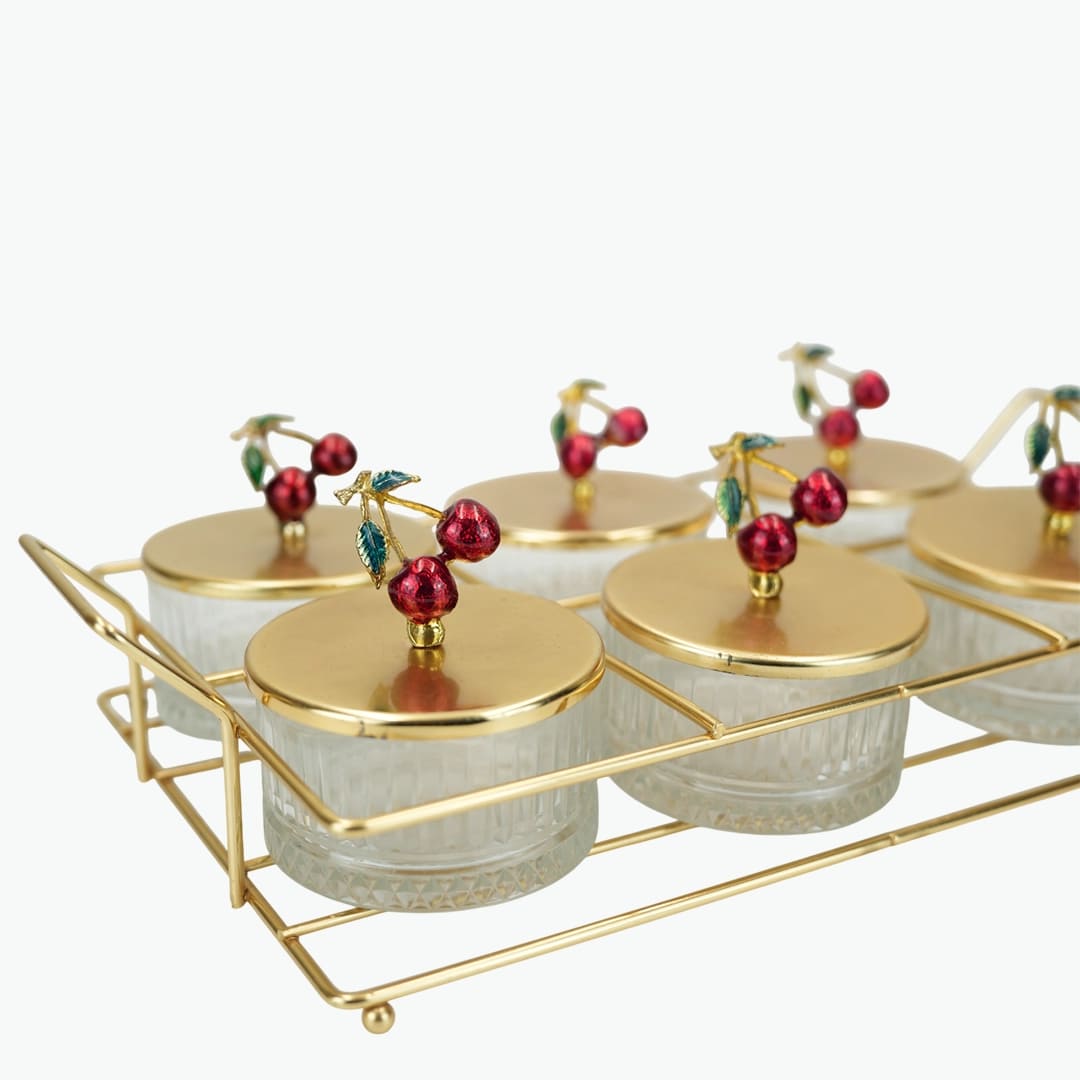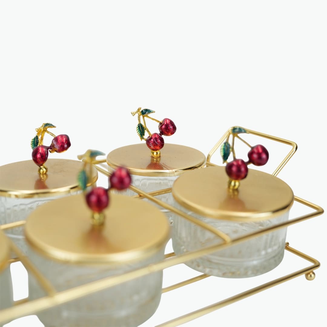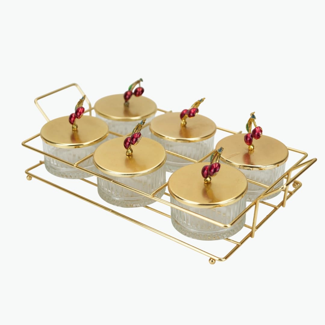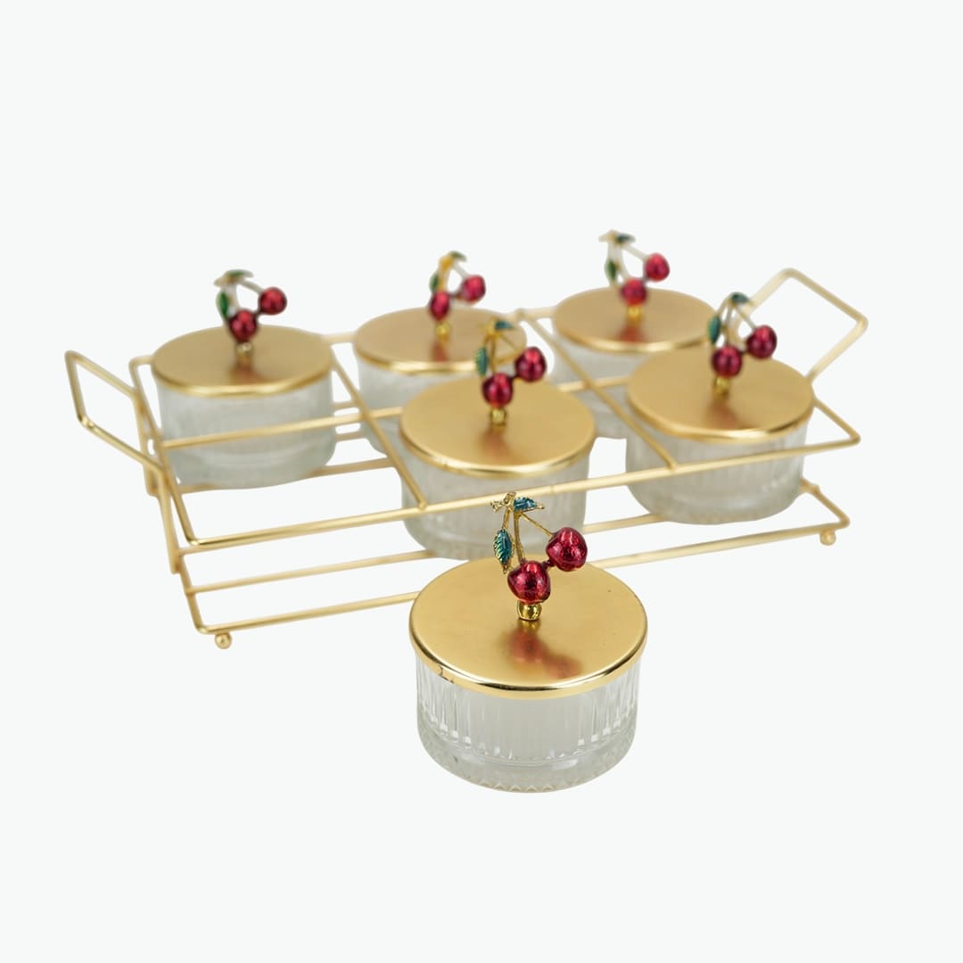 طقم تقديم أنيق بتصميم الكرز مكون من 6 قطع، يتميز بأوعية زجاجية وأغطية معدنية ذهبية