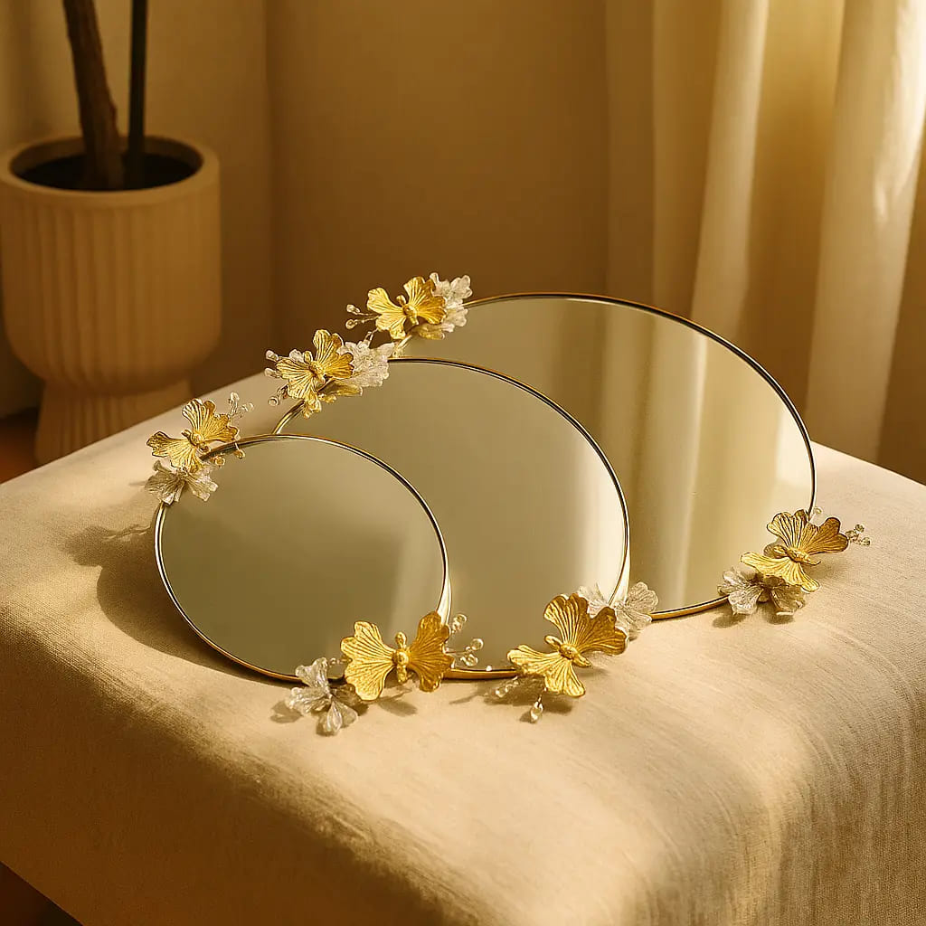 أضف لمسة فاخرة لمنزلك مع طقم مكون من 3 صواني تقديم مرآوية بمقبض على شكل فراشة.
