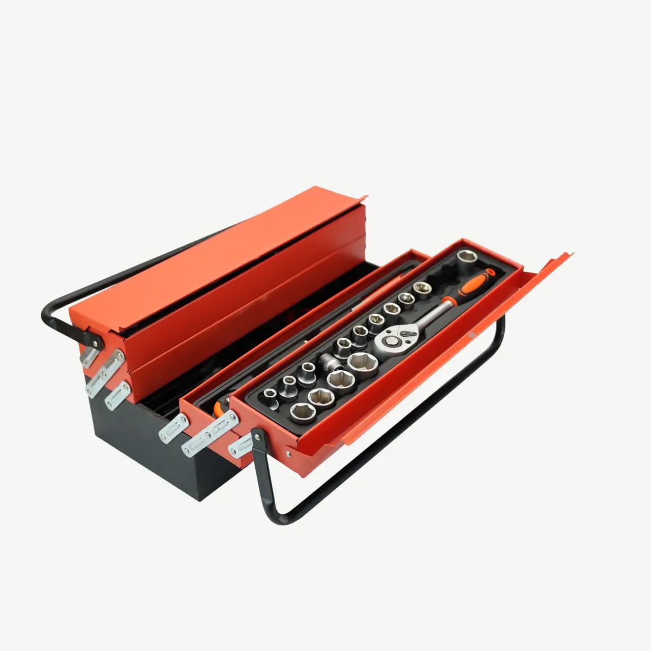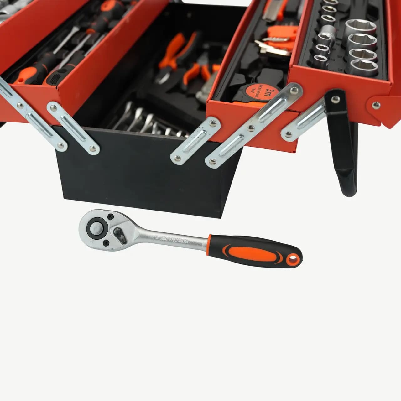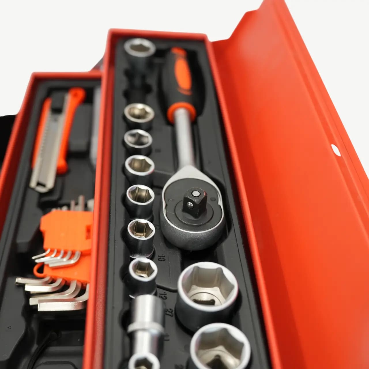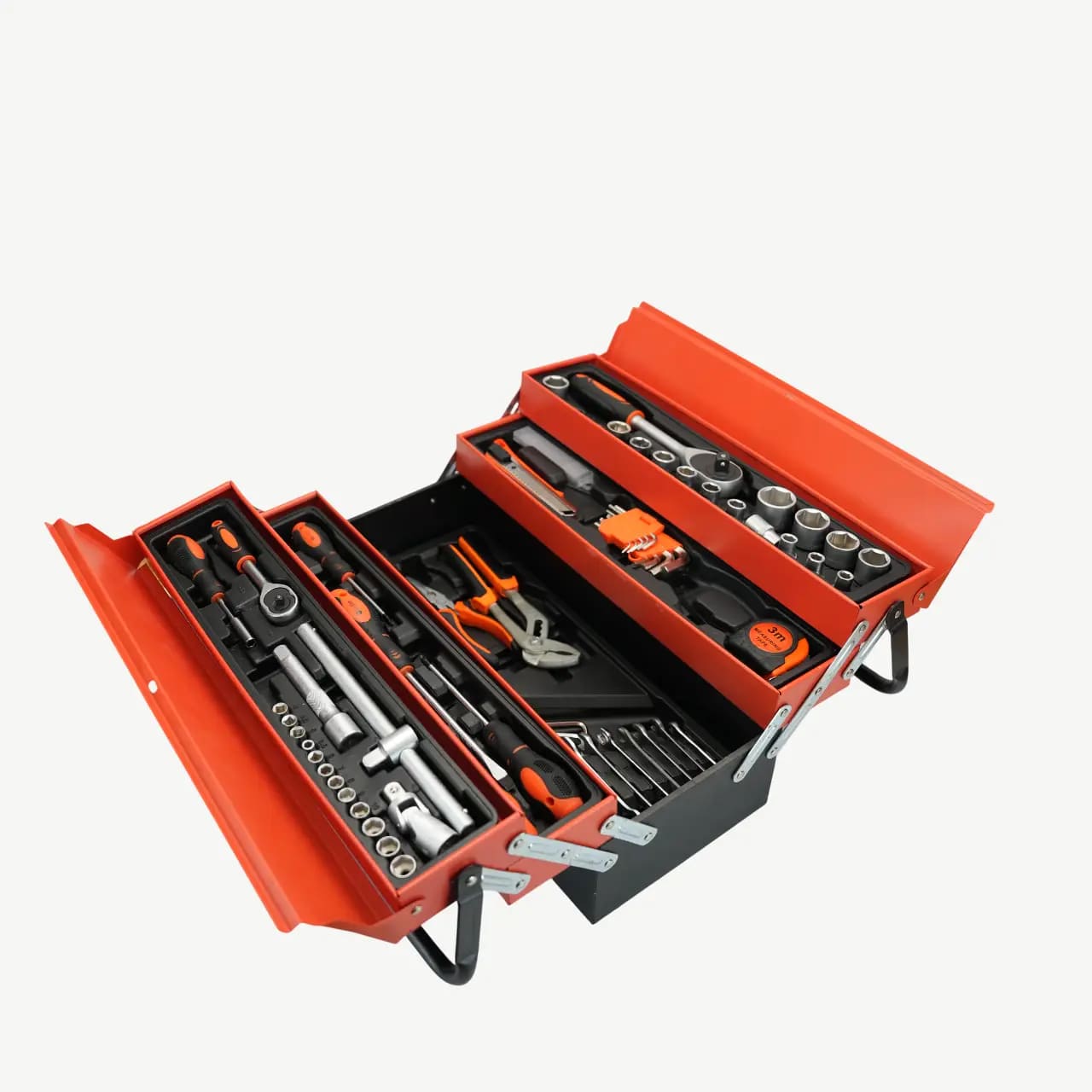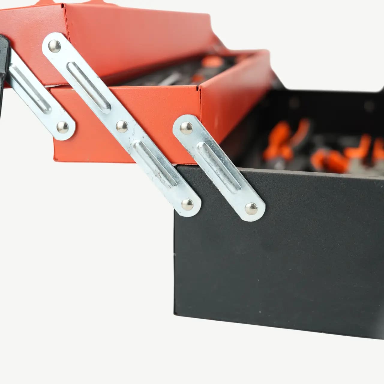 • صندوق الأدوات المعدني القابل للتوسيع: تفتح آلية الفتح المتدرج لتكشف عن صواني متعددة، مما يتيح رؤية كاملة ووصولاً سريعاً لكل أداة، الأمر الذي يضمن أقصى كفاءة في إنجاز المهمة.
