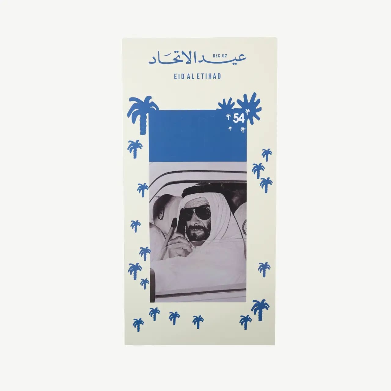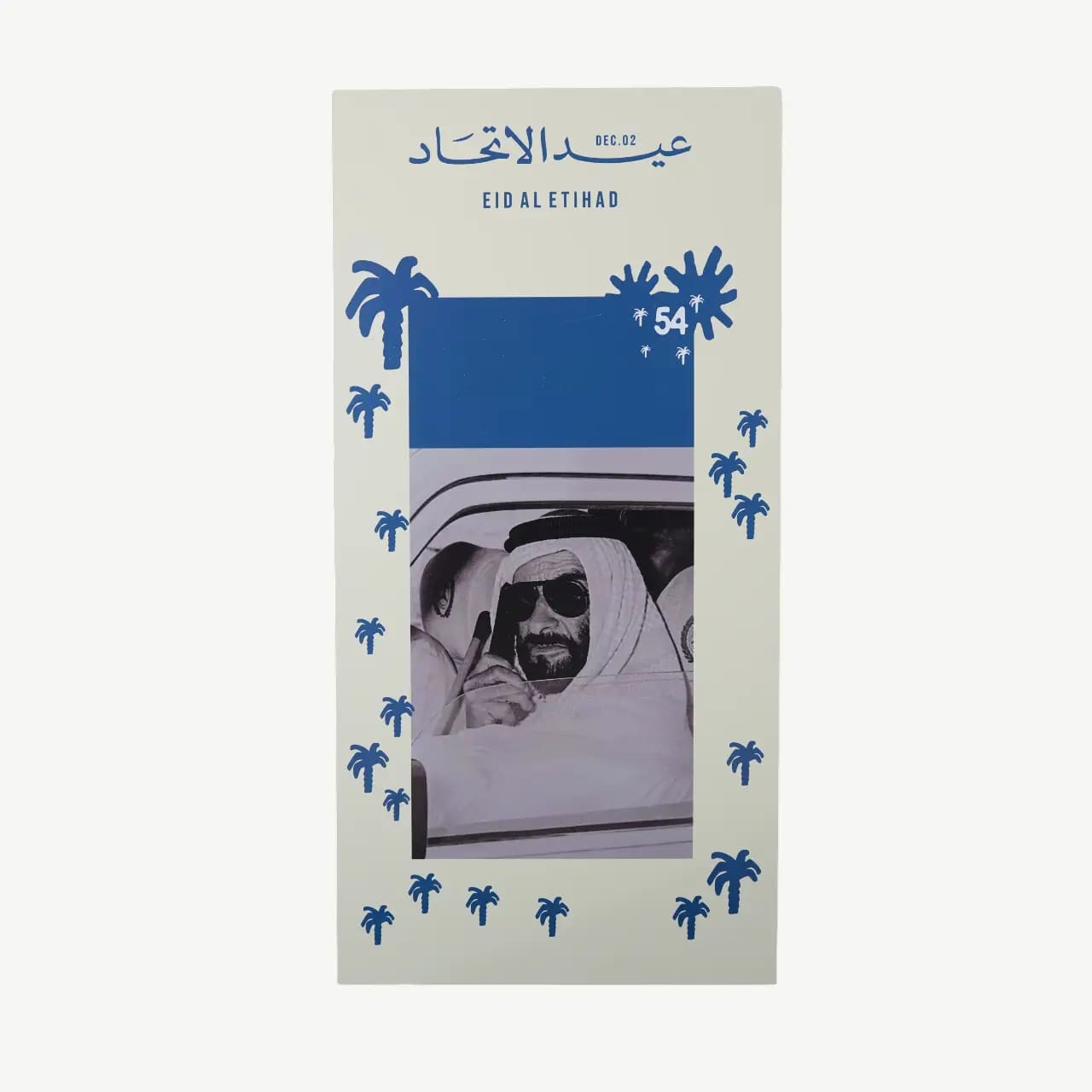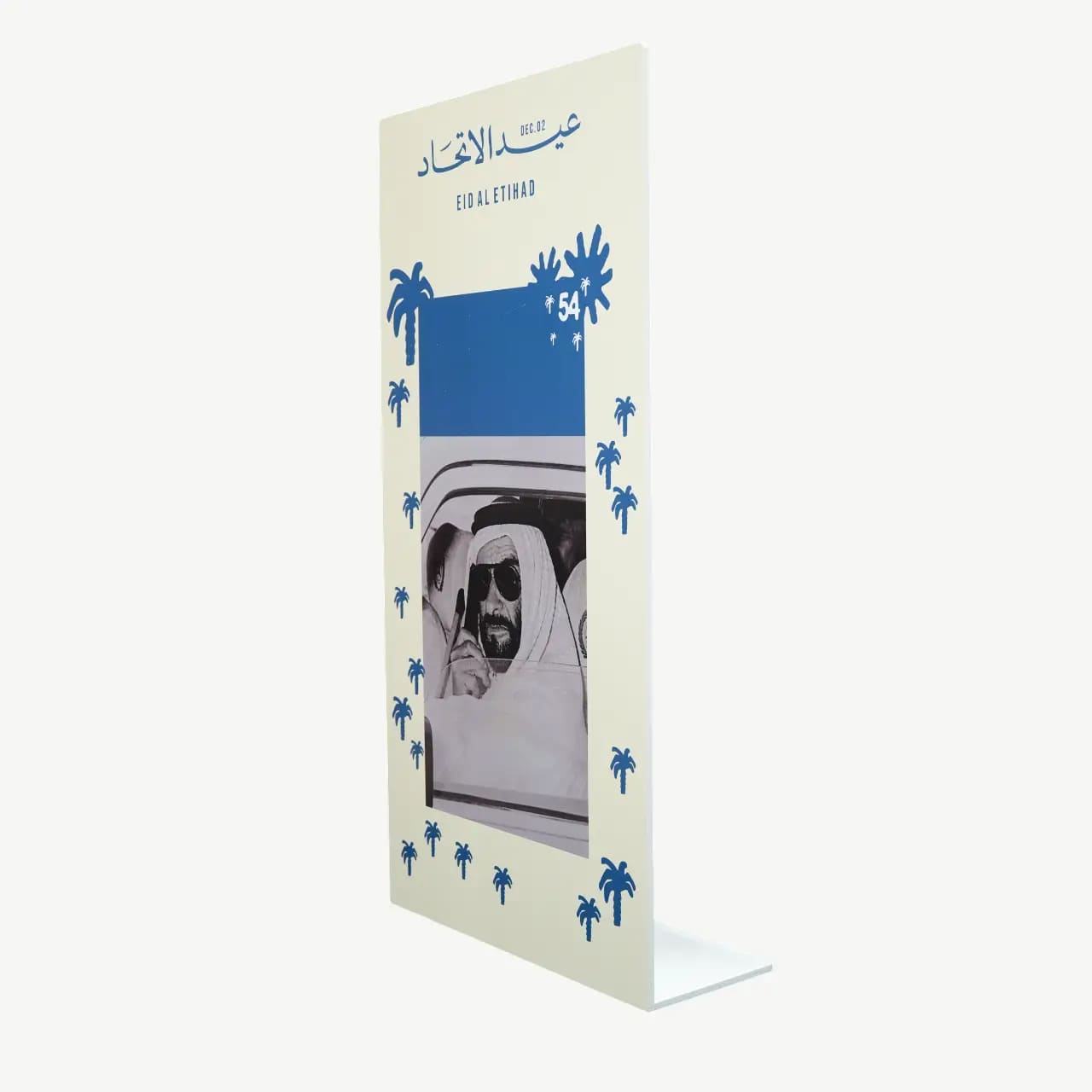 This striking plaque features a beloved, historic photograph of Sheikh Zayed in a candid moment, capturing the humble spirit of the nation’s founder. The black and white portrait is beautifully framed by a modern, white border adorned with blue palm tree silhouettes, symbolizing the progress and tradition he championed. The plaque prominently celebrates the 54th anniversary and the Union Day (Eid Al Etihad, Dec. 02), serving as a reminder of the nation’s foundation.