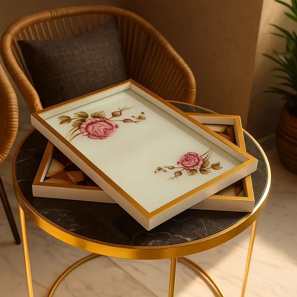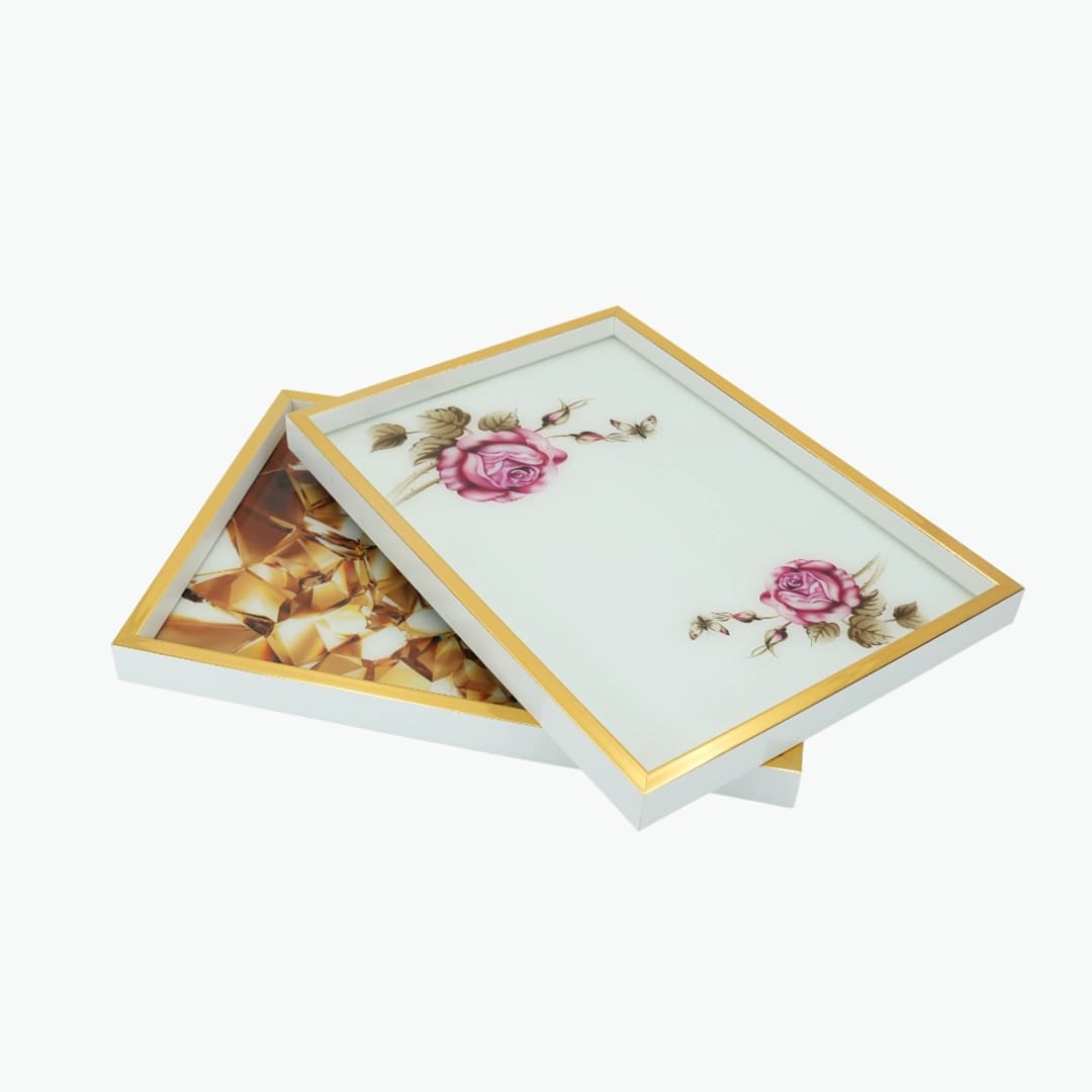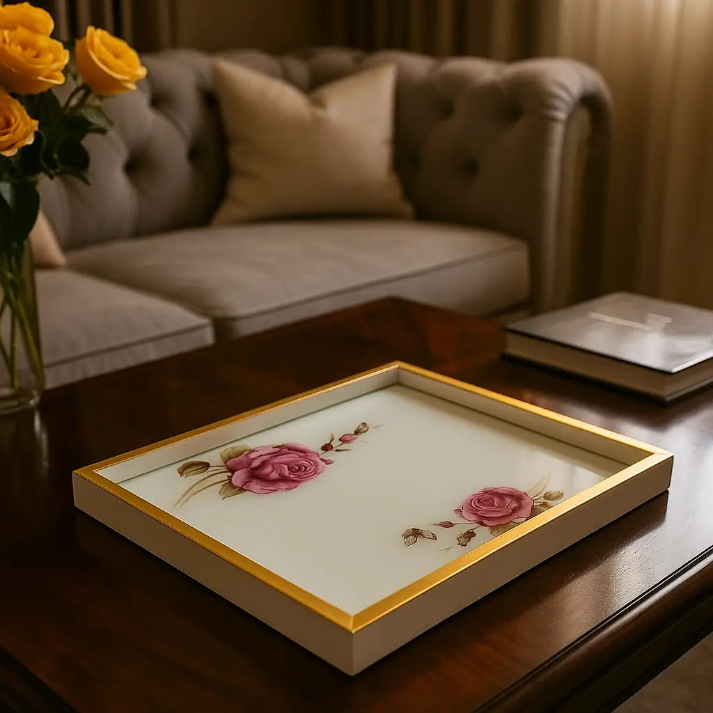 أضف جمالاً خالدًا إلى مائدتك مع صينية التقديم الزجاجية بتصميم زهري من لازود . تتميز هذه الصينية الأنيقة بنقشة وردة وردية رقيقة محاطة بتفاصيل ذهبية، لتضيف لمسة فاخرة لتجربة تقديمك.