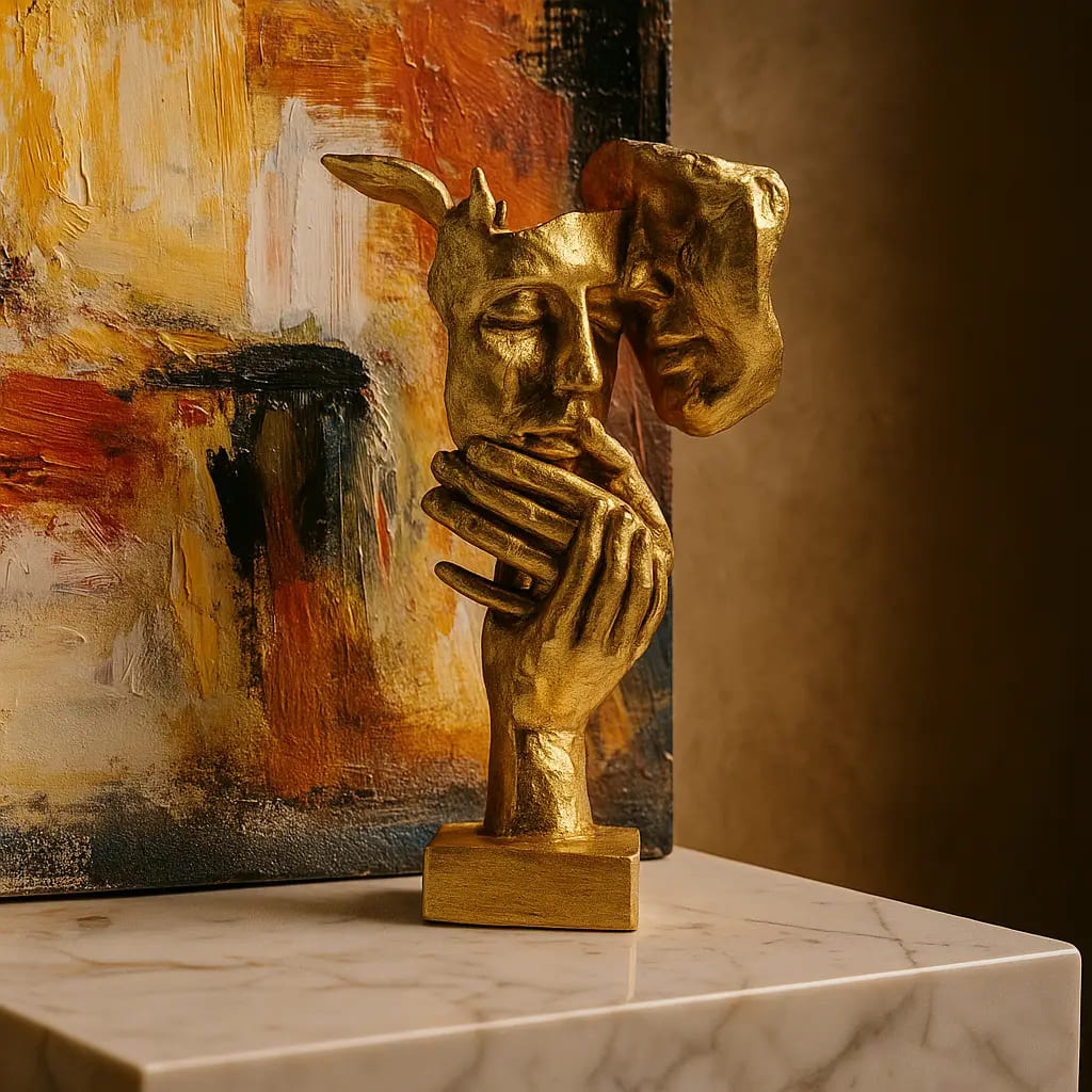 يتميز التمثال بتصميم مذهل لأقنعة ذهبية تجسد نقاء الحب وغموضه. وبفضل طابعه العصري، فإنه يضيف لمسة لافتة لأي مساحة داخلية — سواء في غرف المعيشة، خزائن العرض الزجاجية، مكاتب العمل أو طاولات السرير الجانبية. كما يأتي مزوداً بواقيات في القاعدة لحماية الأسطح من الخدوش، مع الحفاظ على لمسته الفنية الراقية.