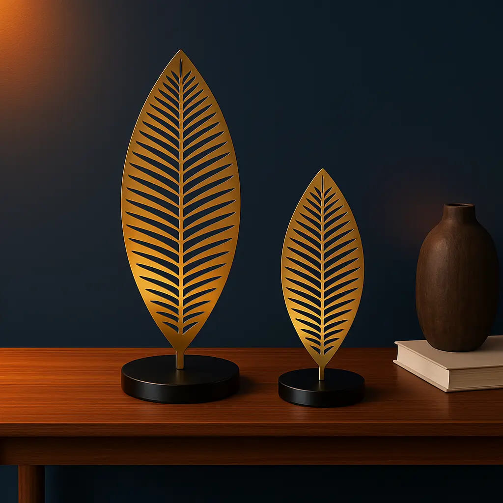 قطعة ديكور ورقة ذهبية معدنية على قاعدة خشبية من لازود هي قطعة ديكور مستوحاة من الطبيعة تجمع بين الأناقة والمعنى.