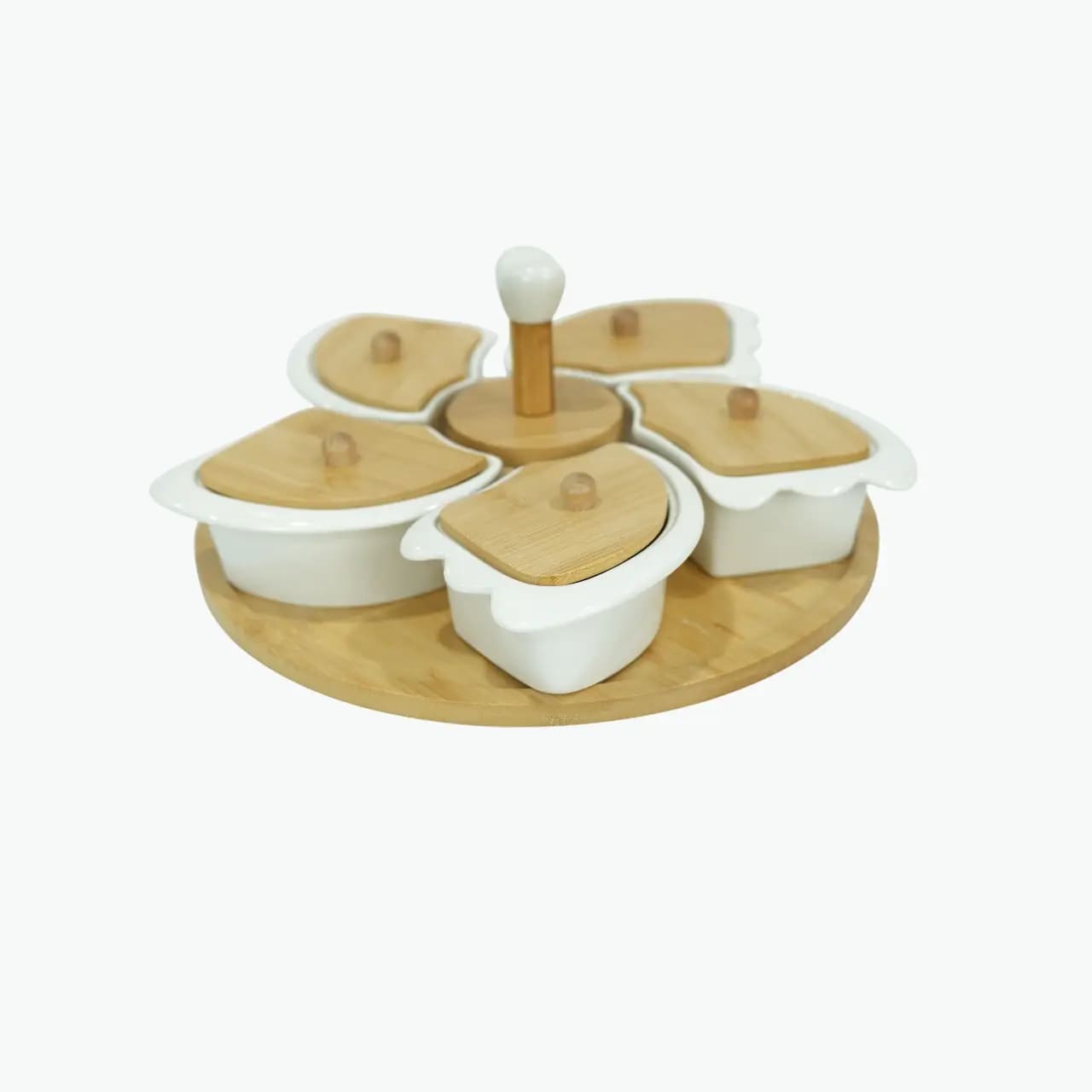 طبق التقديم السيراميكي الفاخر المقسم هو صحن أنيق مكون من سبعة أقسام، مزود بغطاء وتفاصيل ذهبية، مثالي لتقديم المكسرات والحلويات.