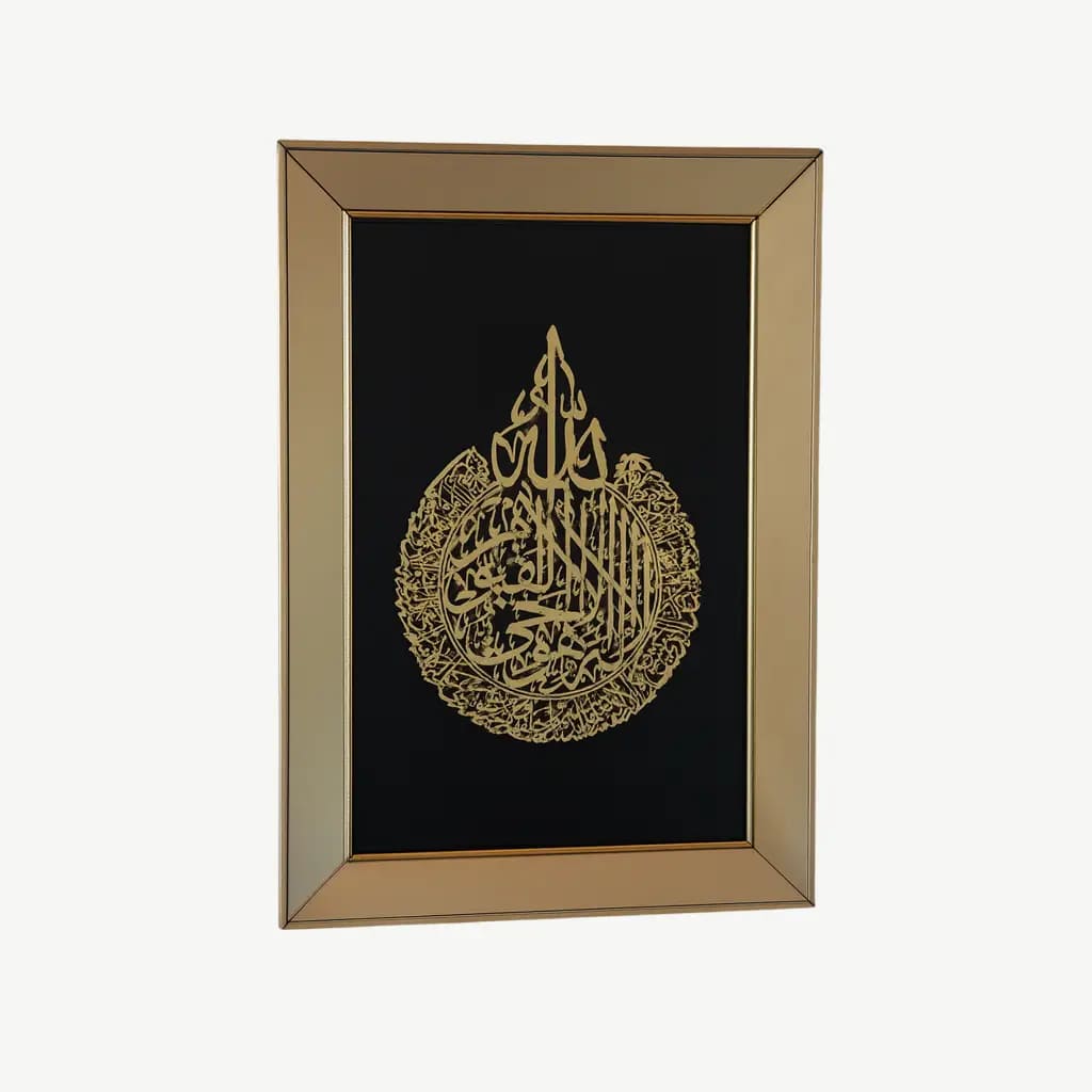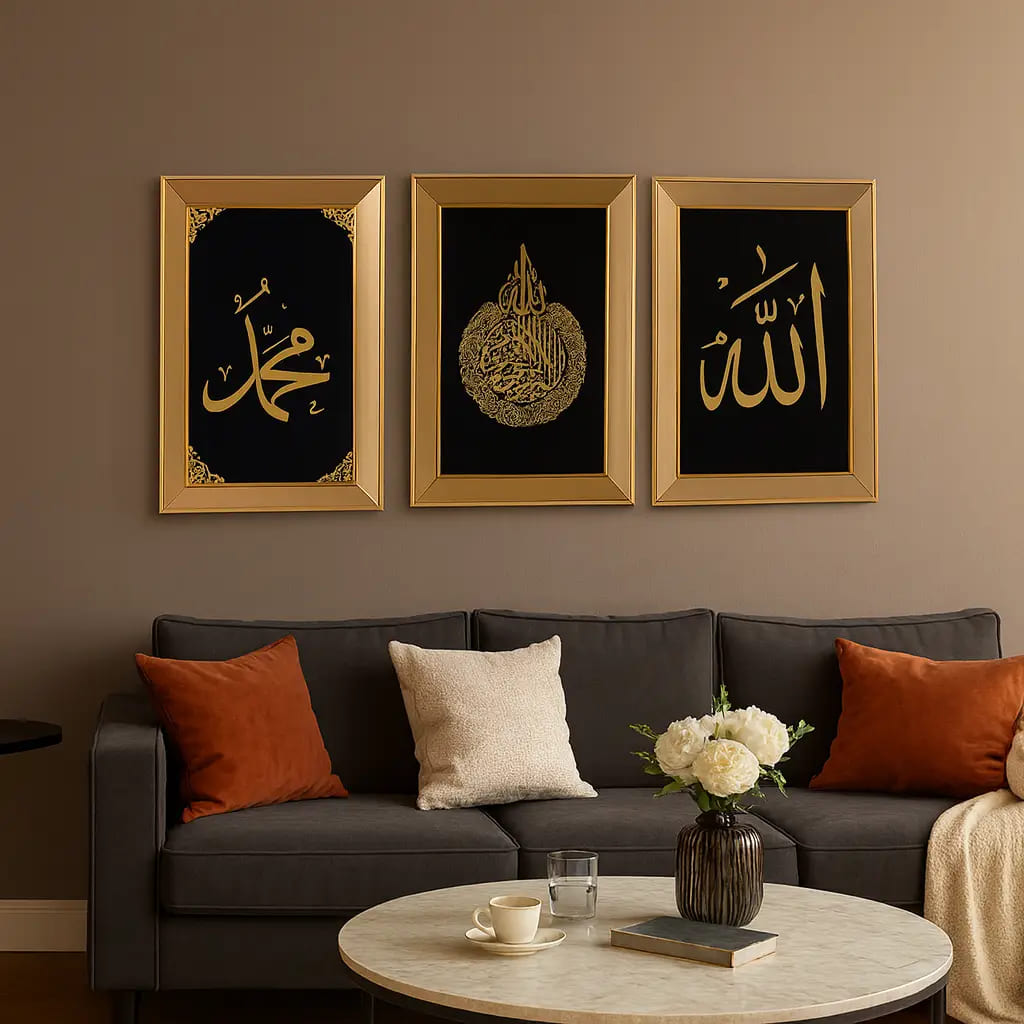 أناقة متناسقة لمنزلك ارتقِ بغرفة المعيشة أو منطقة الاستقبال الخاصة بك مع طقم لوحات الخط الإسلامي المذهل (3 قطع) الفاخرة المؤطرة بالذهبي. متوفر للتسوق السلس عبر الإنترنت في لازود، هذا الثلاثي مصمم للعرض معاً، ليخلق نقطة محورية موحدة وقوية تلهم السكينة والروعة. يجمع هذا الطقم بين العناصر الروحية الرئيسية في خط ذهبي رائع على خلفية سوداء درامية.