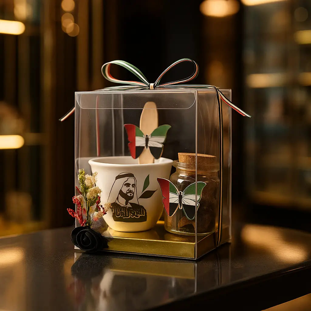 Luxury Packaging: Presented in a clear box with a UAE flag ribbon and floral embellishments.