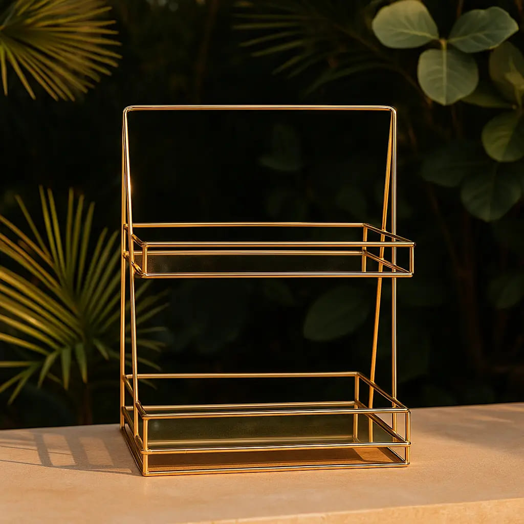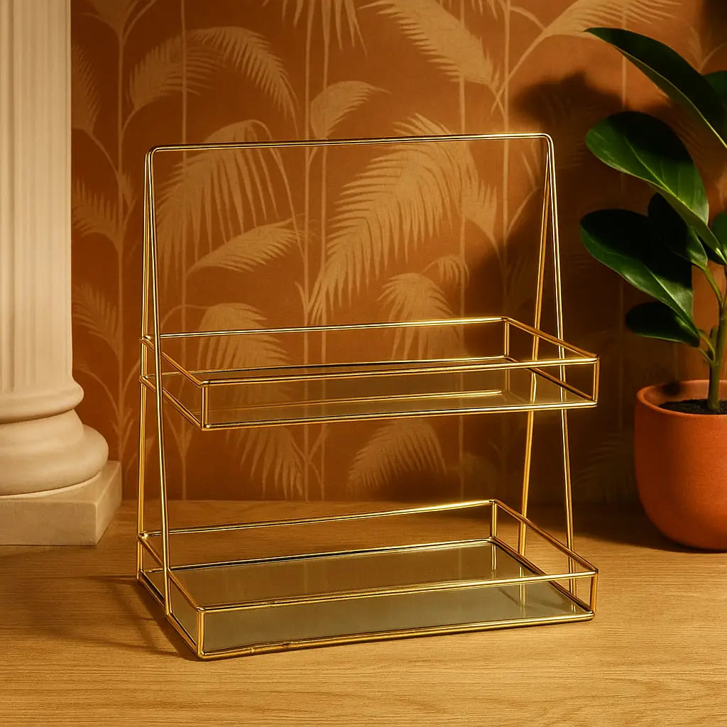 أضف لمسة من الرقي إلى ترتيب طاولتك مع الحامل الهرمي المستطيل بطابقين مع رفوف مرآة.