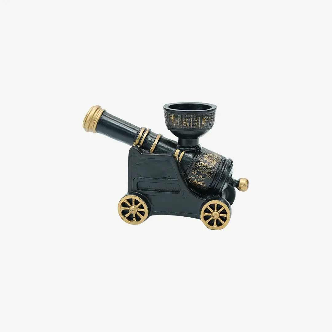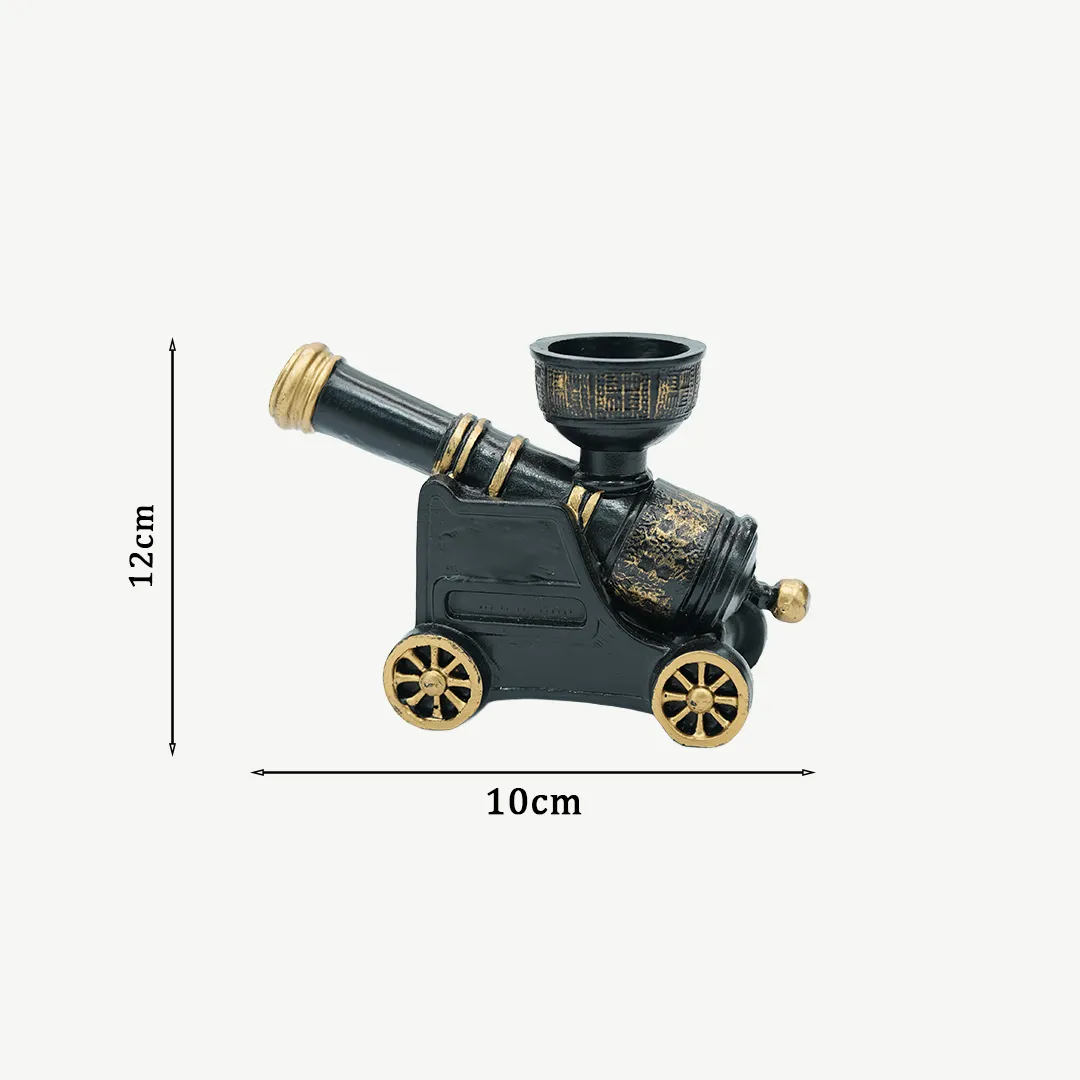 Cannon-Shaped Pottery Incense Burner (12x10cm). Black & Gold finish.