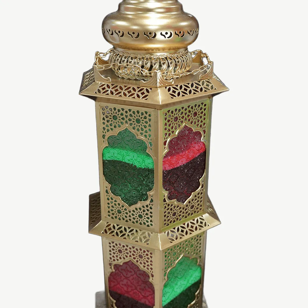 The vibrant stained glass panels work in harmony with the golden finish to transform any light source into a breathtaking display of colorful patterns. Perfect for large candles or LED light strings, it creates a warm, spiritual, and inviting atmosphere in your Majlis, entryway, or living room. Its grand stature and rich cultural aesthetic make it a majestic focal point, blending the golden splendor of heritage with the sacred joy of the holy month.