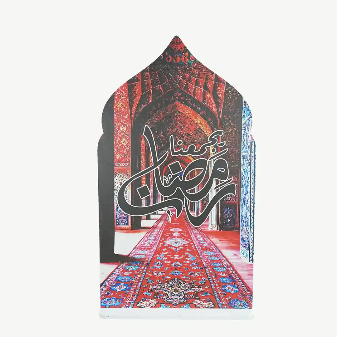 Make a grand statement of faith and hospitality with the Large Ramadan Kareem Wooden Banner Prayer Rug Design. This stunning decorative piece is artfully crafted to resemble the iconic silhouette of a traditional prayer rug, standing at an impressive height of 150cm\85cm and a width of 60cm\40cm. Featuring the “Ramadan Kareem” greeting in elegant Arabic calligraphy, this banner is meticulously made from high-quality natural wood, offering a warm and rustic aesthetic to your festive environment.