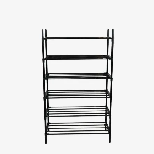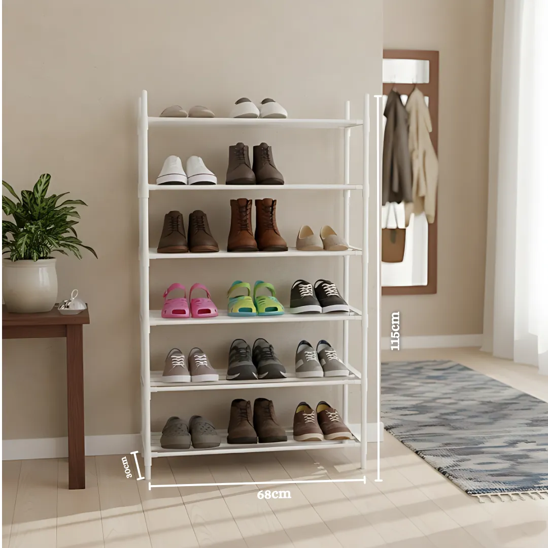 Transform your home organization with the Multi-Layer Shoe Rack with Reinforced Plastic and Sheet Metal. This creative 6-tier storage solution is engineered for durability, featuring thickened sheet metal pipes and heavy-duty reinforced plastic joints. With a large capacity designed to hold up to 12 pairs of shoes, it effectively maximizes vertical space to keep your hallways clean and tidy. The smooth and polished finish adds a sleek touch to your decor while protecting your footwear. Its strong bearing capacity ensures stability under weight, and the tool-free installation makes setup a breeze. Standing 115cm tall, this rack is the ultimate high-quality organizer for modern homes looking for a blend of strength and functional design.