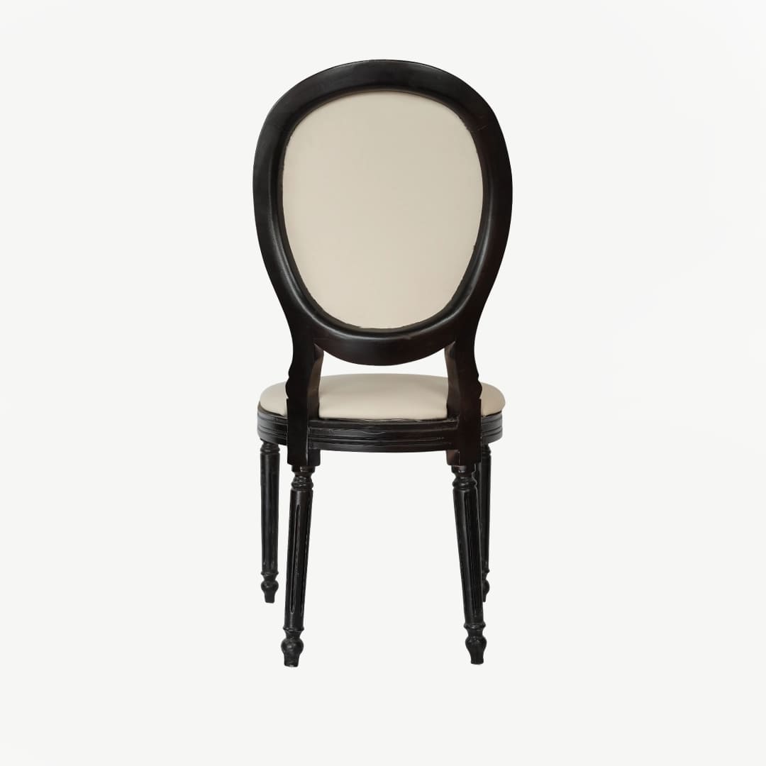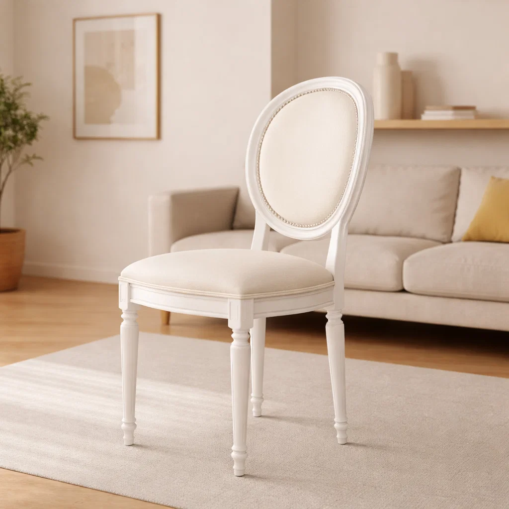 Elevate your dining room with the Oval-back dining chair with an antique walnut finish and soft white fabric 98cm. Royal comfort.