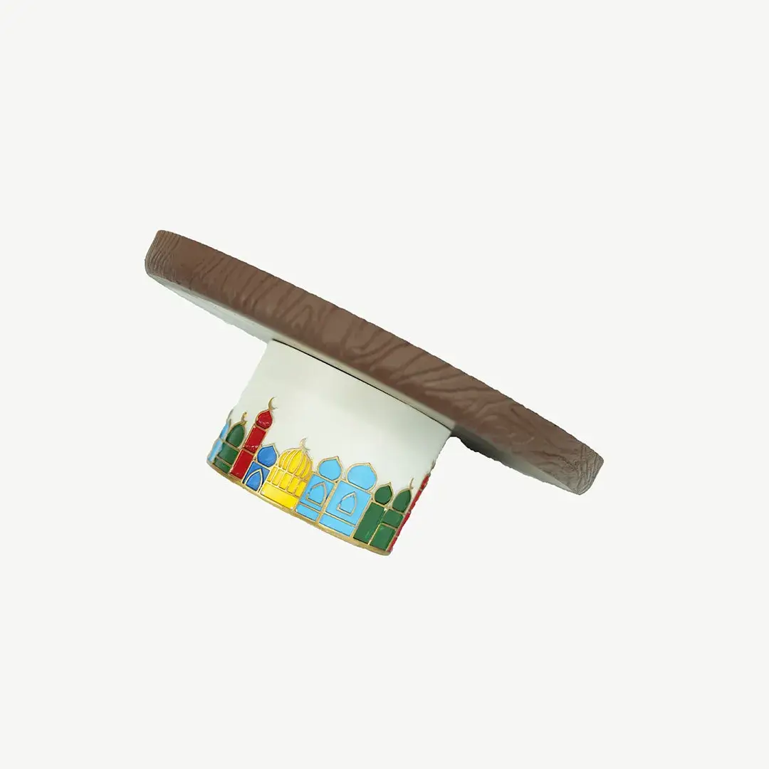 Serve in style with the Ramadan 2-Piece Serving Stand. Features a 20cm wooden top and a colorful ceramic mosque base.