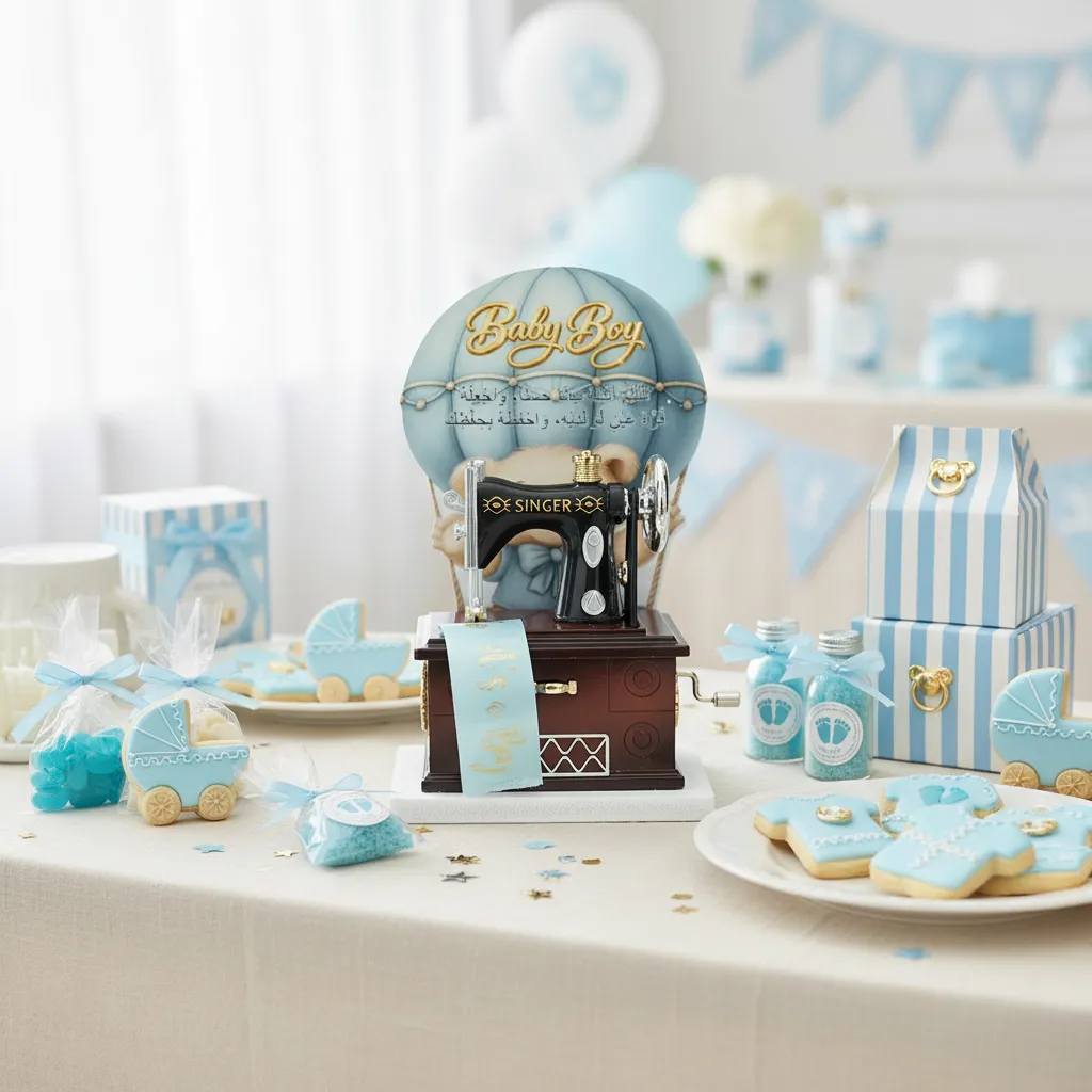 Celebrate the arrival of your new prince with the Wooden music box sewing machine decorated with a hot air balloon Baby Boy, a charming and timeless keepsake designed for UAE families. This exquisite piece combines traditional craftsmanship with a heartwarming touch, featuring a beautifully detailed wooden sewing machine that plays a soothing melody. Adorned with a cheerful blue hot air balloon carrying the “Baby Boy” message, it serves as a perfect centerpiece for baby shower celebrations or home decorations. Measuring 18×12 cm, this Wooden music box sewing machine decorated with a hot air balloon Baby Boy is crafted from high-quality wood and durable plastic elements, ensuring it remains a cherished memory for years to come.
