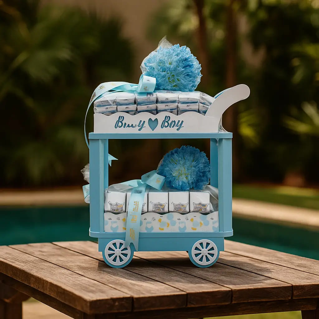 Announce your joy with the adorable Baby Boy Celebration Gift Trolley! This charming blue wooden cart is filled with premium chocolates/favors and decorated beautifully.