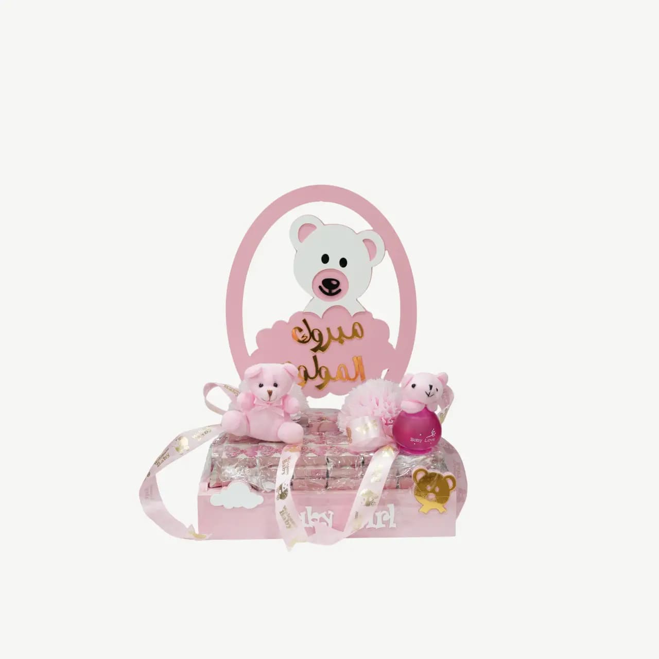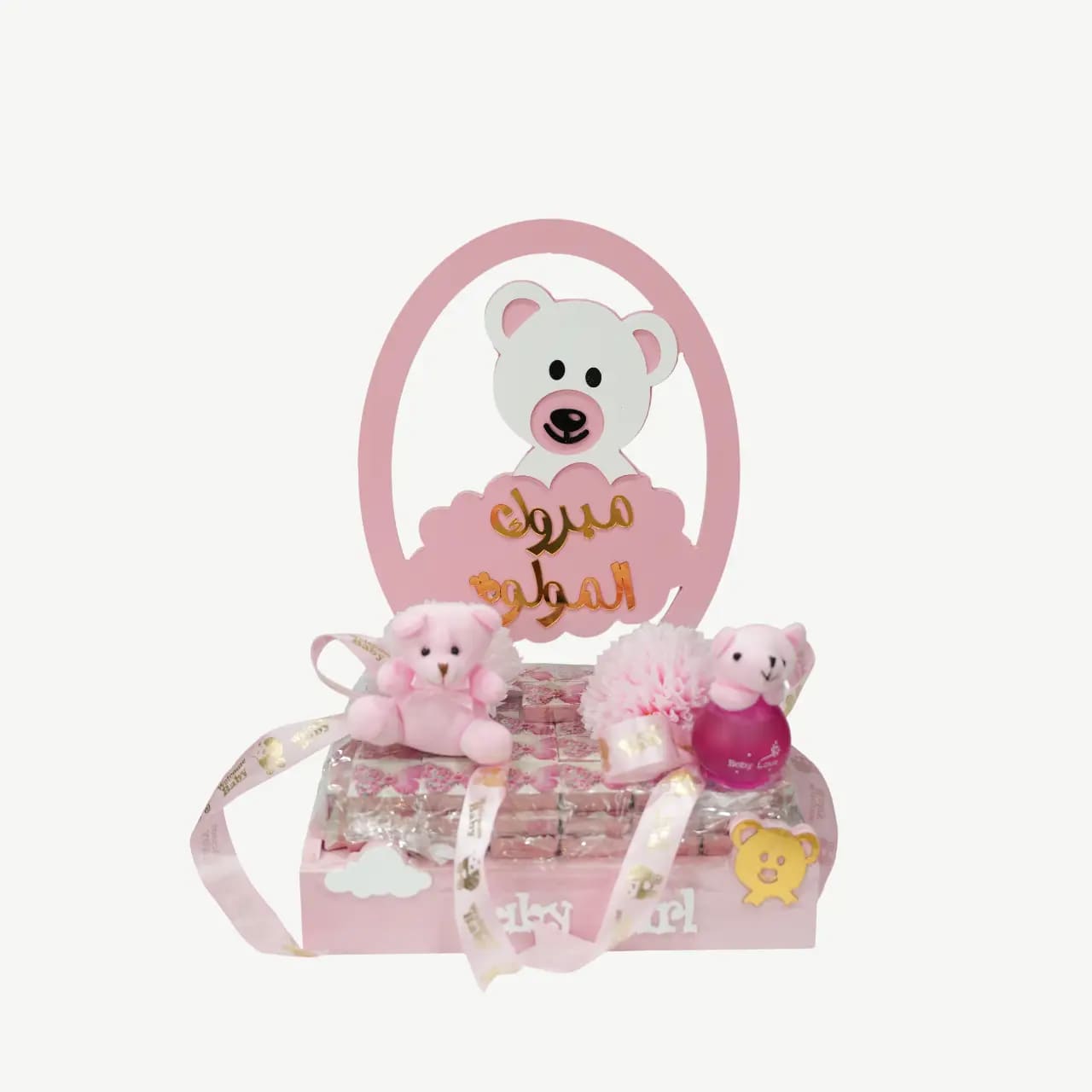 Celebrate the joy of a baby girl with the delightful Baby Girl Teddy Bear Gift Hamper, a charming and complete gift solution offered by Lazood. This high-quality pink wooden box or base is designed to be a memorable keepsake, crowned with a distinctive oval backing featuring a white teddy bear and the Arabic celebratory message “مبروك المولود” (Congratulations on the Newborn). The hamper is generously filled with perfectly wrapped favors (chocolates/sweets) and meticulously decorated with soft pink teddy bears, decorative ribbons, and floral accents.