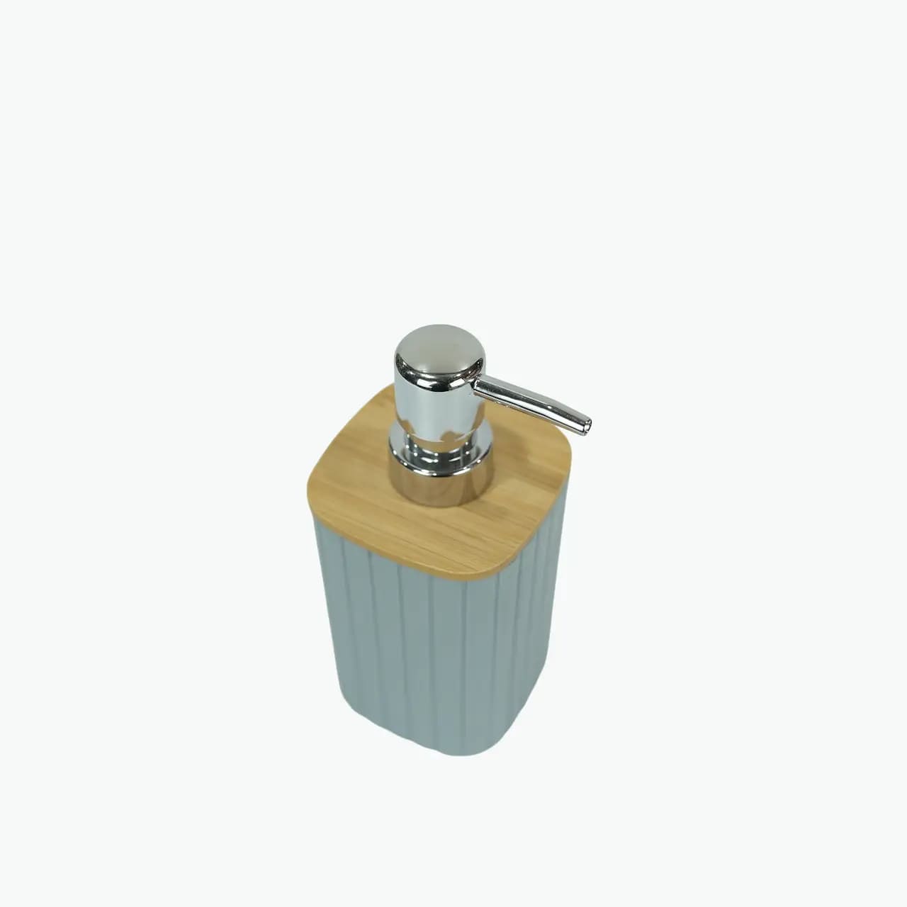 Add a touch of contemporary elegance to your bathroom or kitchen with the Blue Ribbed Soap Dispenser with Bamboo-Look Top. Featuring a soothing light blue body and a premium chrome pump, this dispenser combines style and practicality.