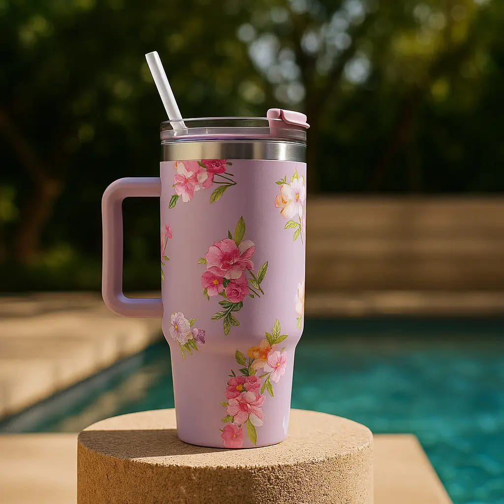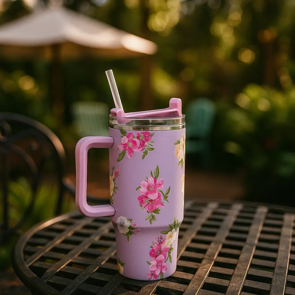 Make a statement while you stay refreshed with the gorgeous Floral Print Hydration Tumbler. This high-capacity, insulated cup combines robust thermal performance with a soft, feminine aesthetic. The vibrant lavender base is adorned with a stunning array of pink, blue, and white flowers, transforming a simple necessity into a chic accessory. Perfect for long drives, busy office days, or simply relaxing at home, this tumbler ensures your beverages remain ice-cold or piping hot for hours.
