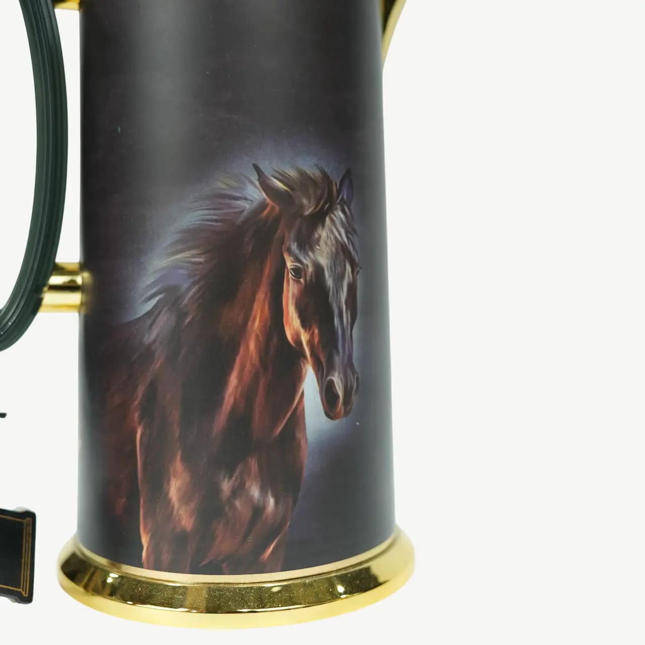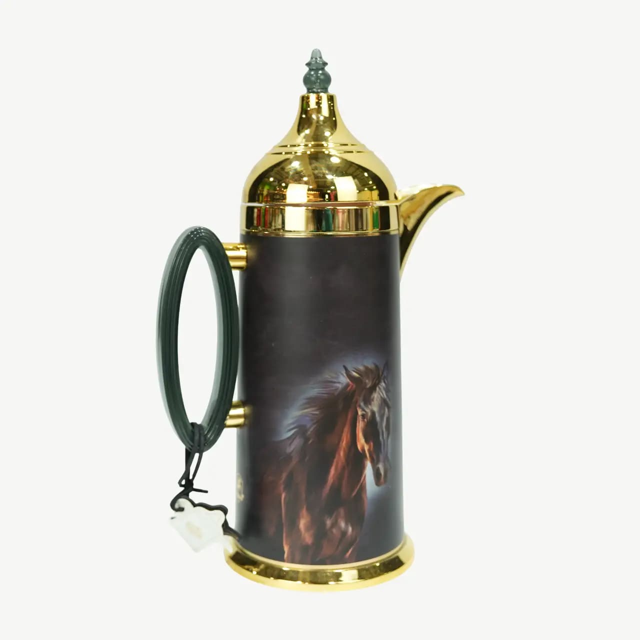 Celebrate Arabian elegance with the magnificent Golden Arabian Horse Dallah Thermos. Featuring a glossy gold spire and lid, and a striking portrait of a majestic horse against a deep black background, this is the ultimate serving piece.