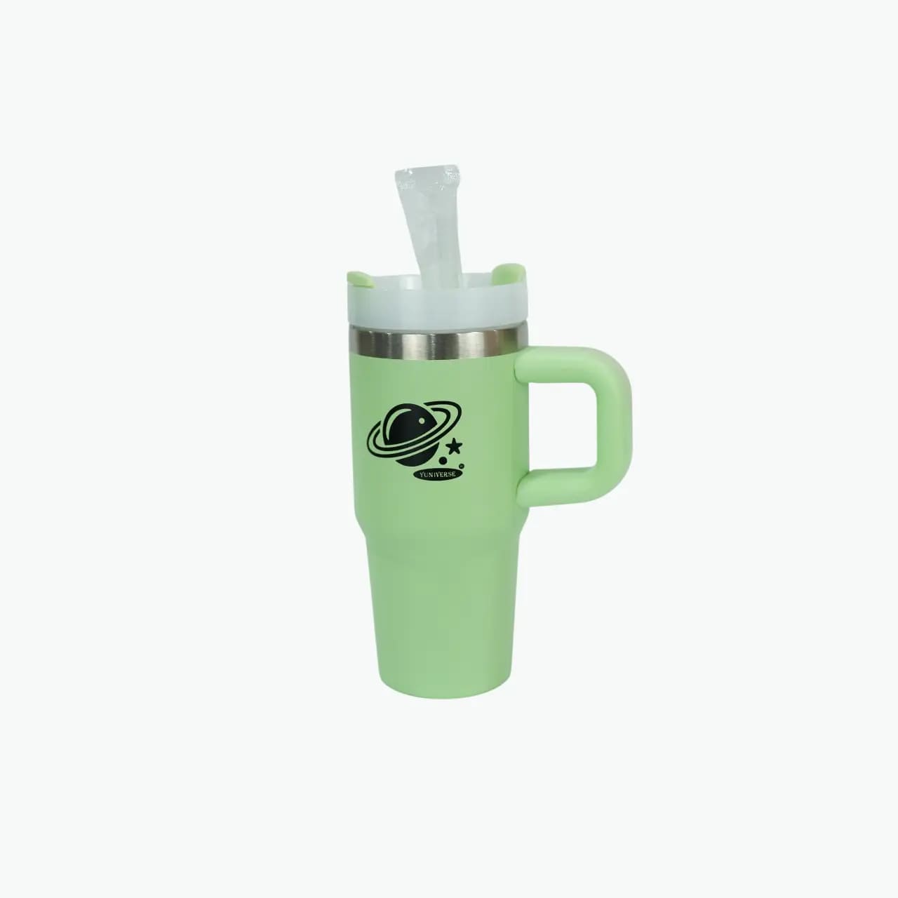 Keep drinks hot or cold all day with the stylish Green Planet Insulated Travel Mug. Features a handle, straw, and fun cosmic graphic.