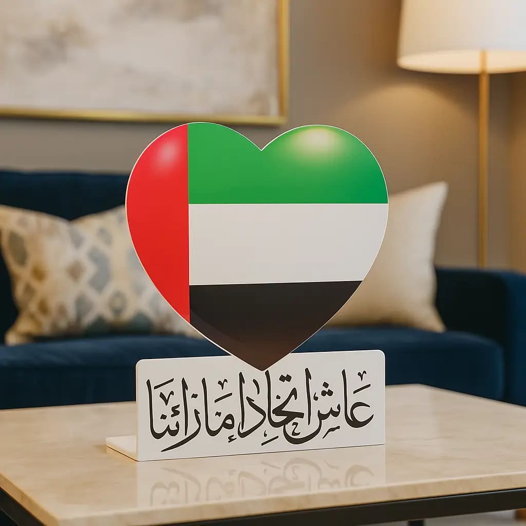 The Heart-Shaped UAE Flag Desk Ornament is a touching and elegant way to celebrate national pride and devotion. Available exclusively at Lazood, this unique souvenir combines modern design with deep sentiment. The main feature is the high-definition display of the UAE flag rendered in a perfect heart shape, symbolizing the love and unity of the nation. It stands proudly on a sleek, white base intricately adorned with inspirational Arabic calligraphy.