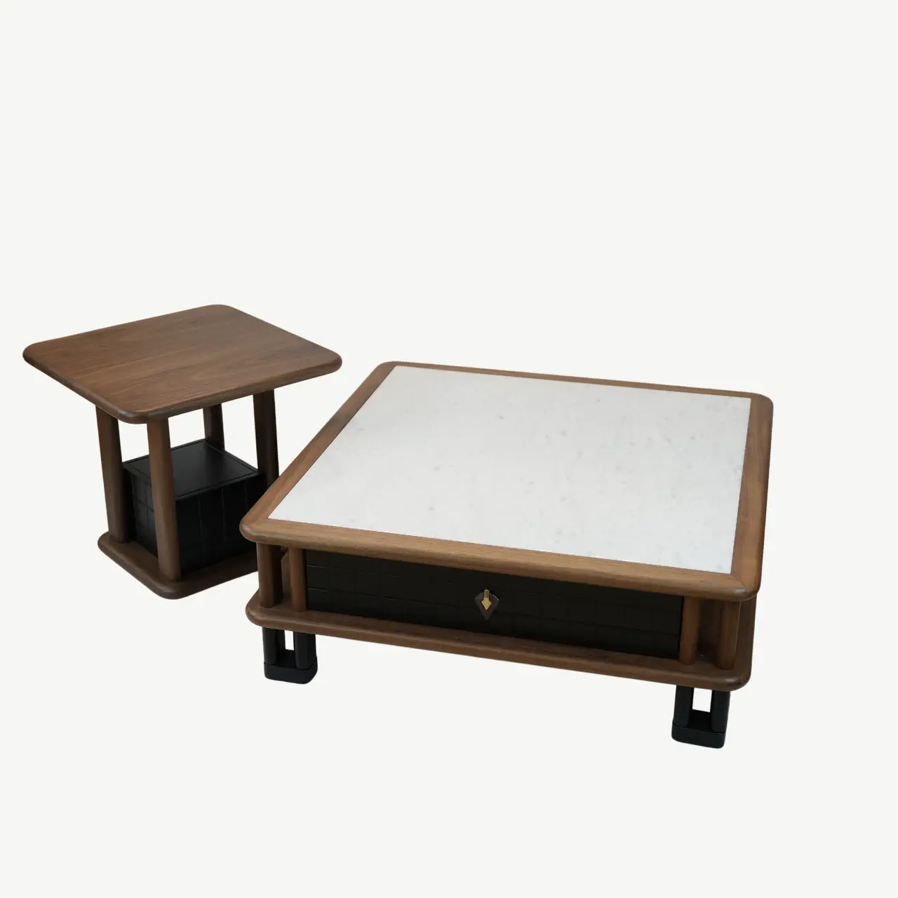 Both tables in the Libra Coffee Table Set are built on a solid foundation of durable Wood, providing warmth and stability. The surfaces are finished with a luxurious Marble top, adding a touch of natural elegance and making cleaning effortless. The high-contrast pairing of wood and marble ensures a sophisticated, eye-catching look.