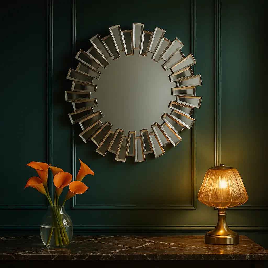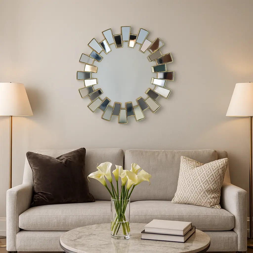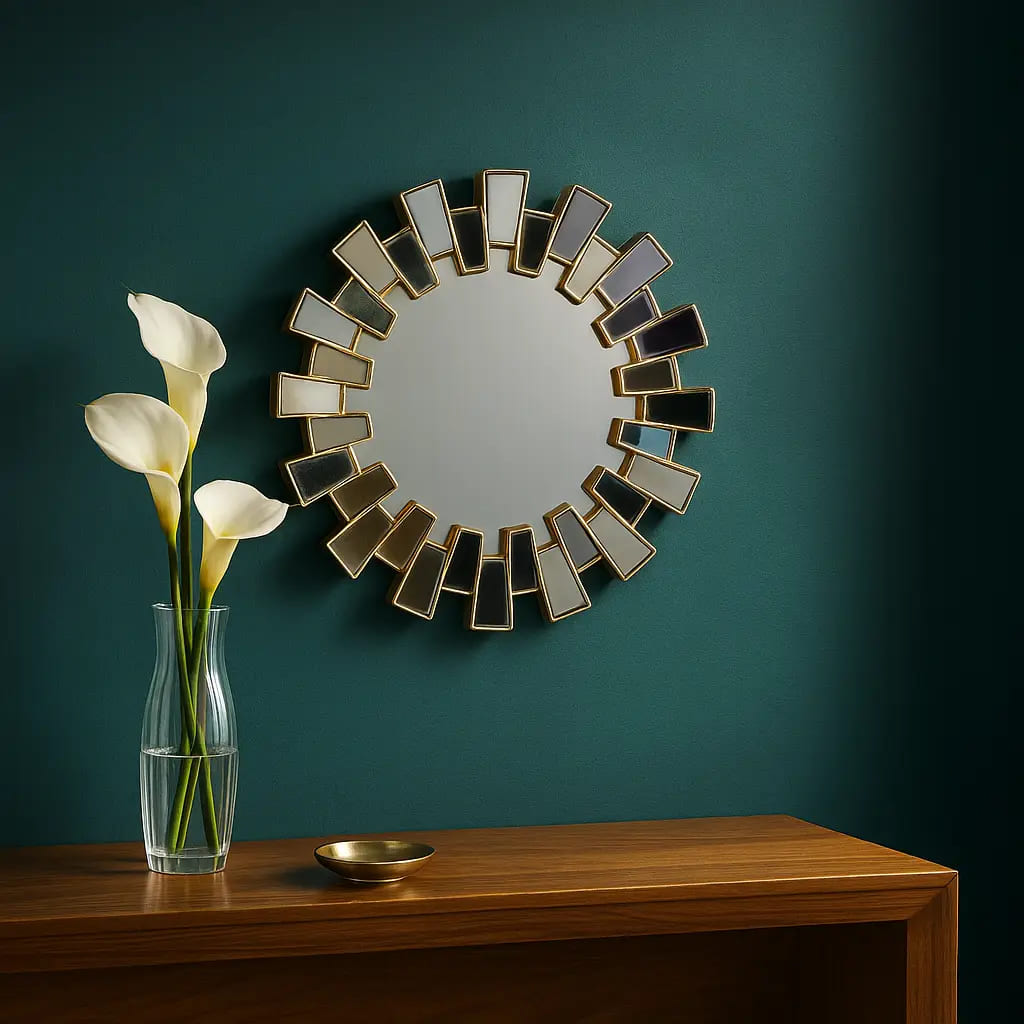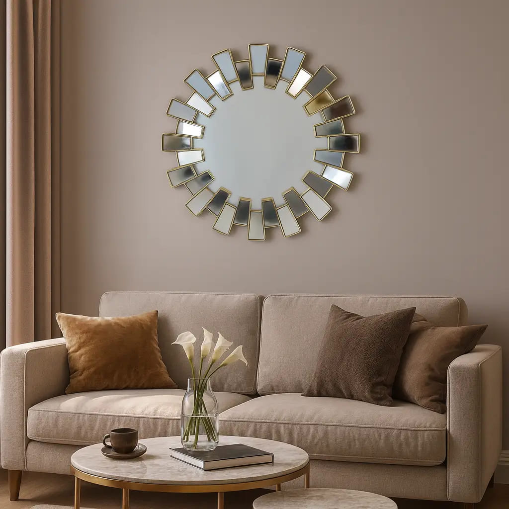 Capturing Light with Art Deco Flair. The Luxury Sunburst Wall Mirror is more than just a functional item; it is a radiant piece of high-end wall decor that instantly elevates the ambiance of any room. Inspired by classic Art Deco and mid-century designs, this mirror features a central circular mirror surrounded by an array of angled, rectangular reflective segments, creating a captivating sunburst effect. This must-have item is available exclusively in the Lazood online store.