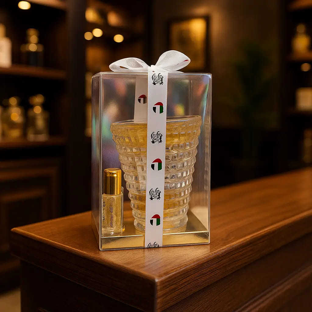 Accompanying the Mabkhara is a complimentary miniature bottle of Arabian perfume or concentrated oil, perfect for layering scents or using as a personal fragrance on the go. Both items are presented together on a unified display base, often featuring subtle patriotic elements or clean, modern packaging, making it an exceptional gift for National Day celebrations. When you Buy this distinctive set from the Lazood online store, you secure a refined, high-quality offering that perfectly captures the luxurious essence of the UAE.