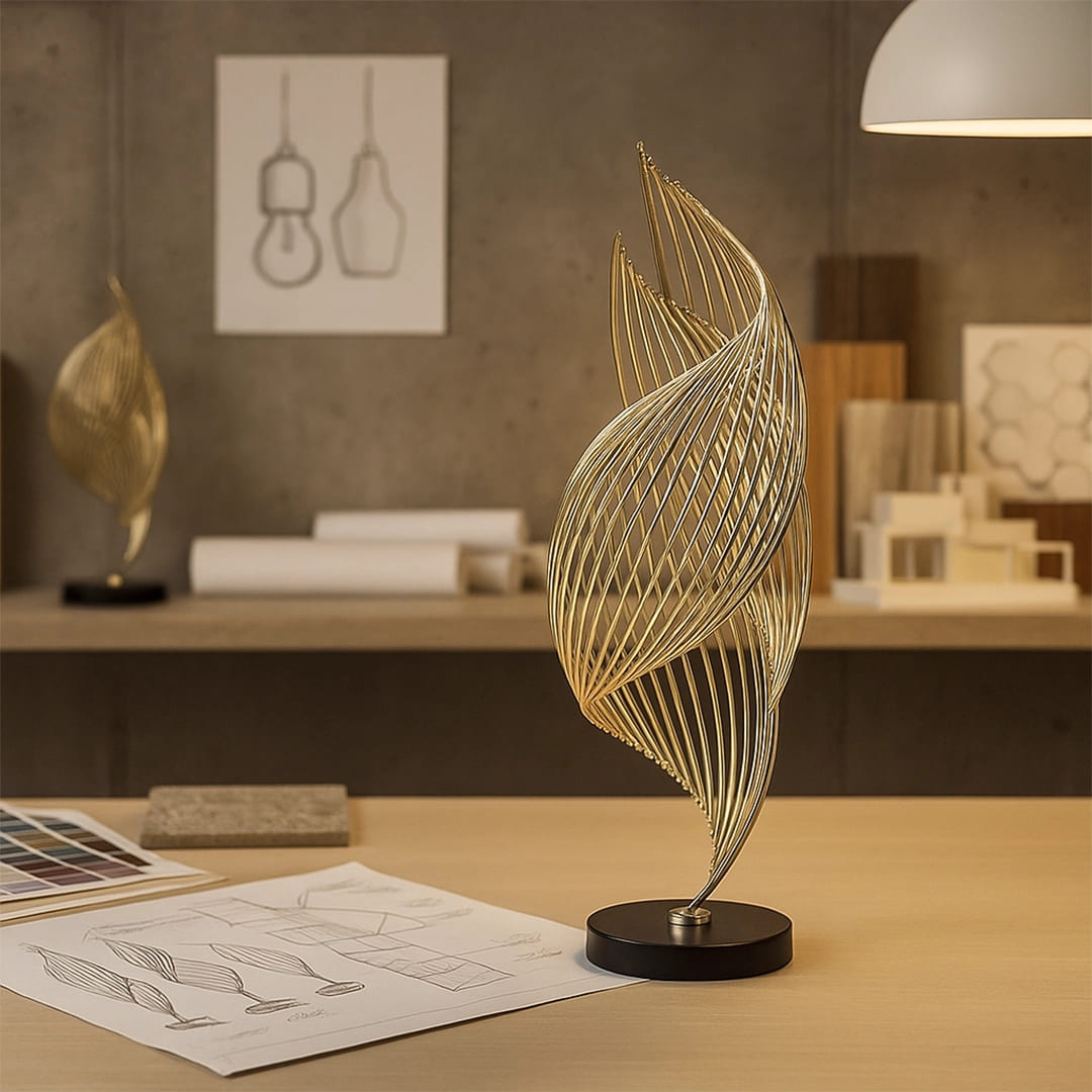 Its design embraces the concept of light luxury, blending simplicity with elegance. The smooth marble texture ensures stability and balance, while the metallic curves form a graceful circular silhouette — a statement of refined taste and artistic charm.