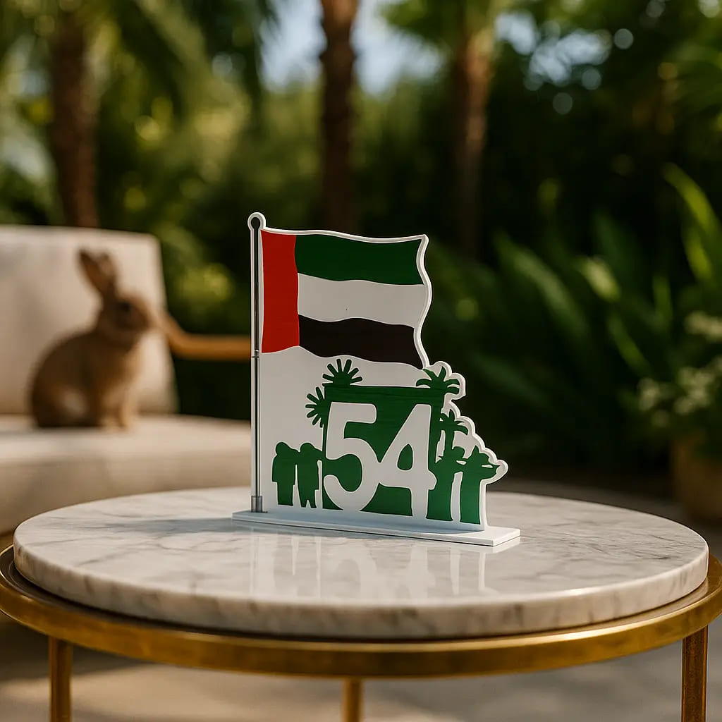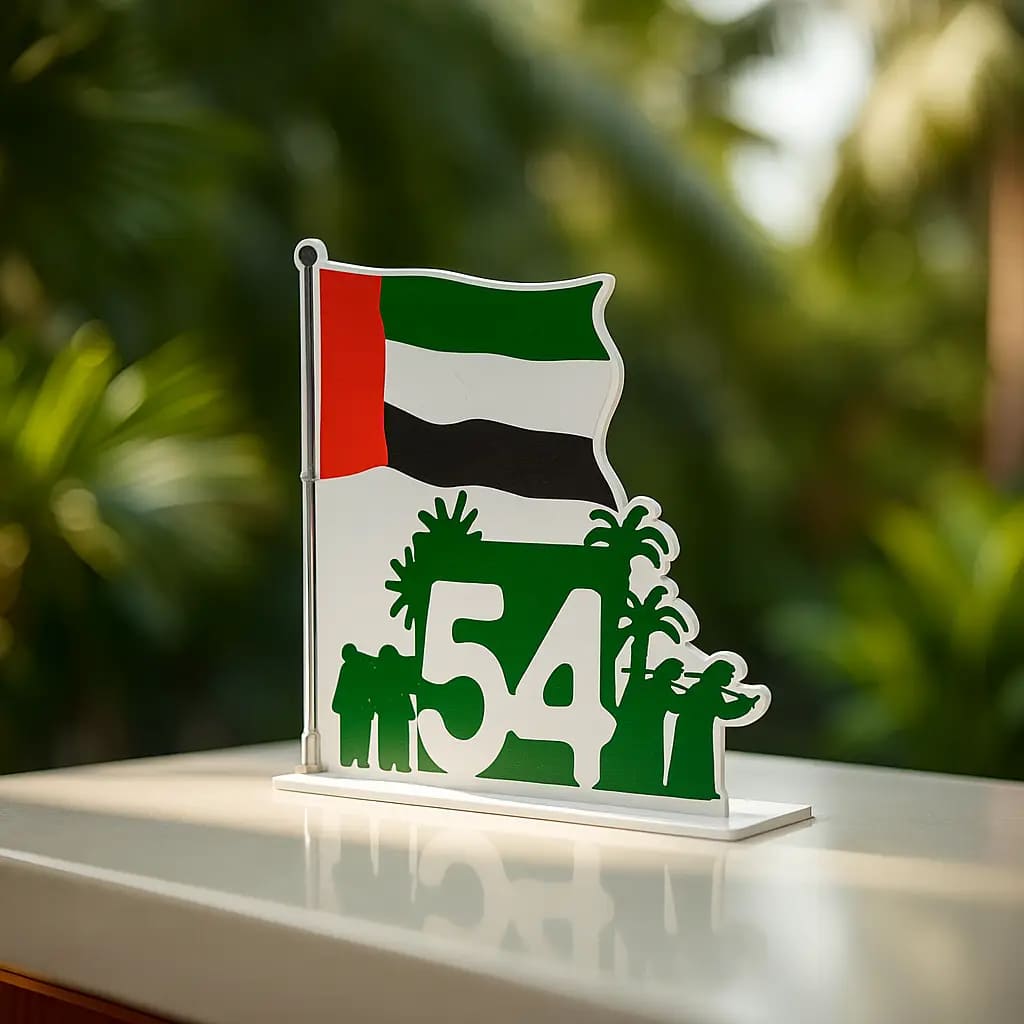 A stylish UAE 54th National Day Desktop Plaque by Lazood. Features the UAE flag, ’54’ anniversary number, and cultural silhouettes.