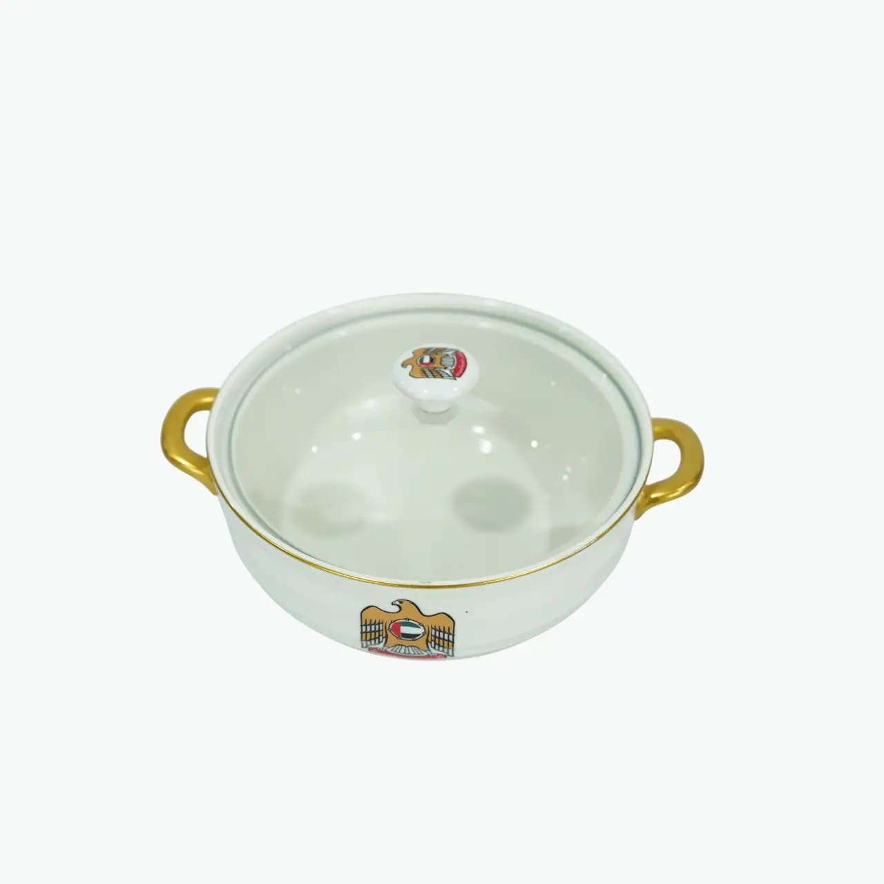 The UAE Emblem Ceramic Serving Pot is a white ceramic dish with gold handles, a glass lid, and the UAE national emblem.