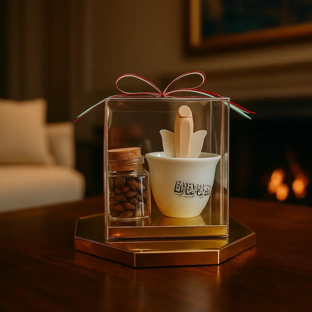 Share the rich tradition of Arabian coffee with the elegantly packaged UAE Heritage Mini Coffee Gift Set. Available for your gifting needs through Lazood, this set is perfect for corporate favors, guest distribution, or National Day commemorations. The contents are beautifully displayed in a premium clear acrylic box tied with a patriotic ribbon in the UAE flag colors.