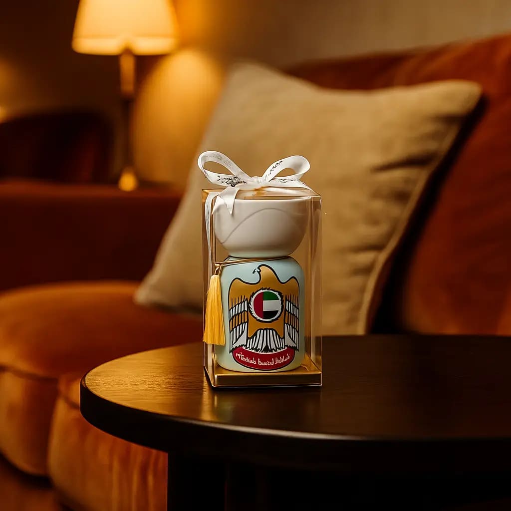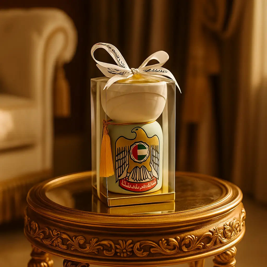 The container is topped with a pristine white cap, and the entire item is encased in a clear acrylic gift box and tied with a chic white ribbon, making it a perfect, ready-to-present gift. Ideal for corporate gifts, diplomatic occasions, or for showcasing small luxury items like dates or sweets, this container combines utility with profound cultural symbolism. Easily order this unique product through Lazood online shopping and bring a touch of Emirati luxury to any space.